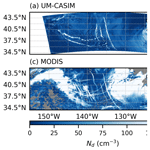 With our initialised background aerosol field of 200 cm−3, we produce a relatively clean cloud droplet background of roughly 50 cm−3. This is largely in line with that seen in satellite observations (Fig. 7a, c), however we note that two large sources of cloud droplets are missing from our model simulation. This is likely due to our initialisation from a constant aerosol field, and therefore we are missing these sources of aerosol in our simulation. Future work in initialising from a more realistic aerosol field would be beneficial, and the limitations of our simplified aerosol configuration are discussed in Sect. 4.1.2. Due to simplifications in the composition of aerosol field, we do not evaluate the model representation of model microphysics and consider mainly the LWP adjustment to the ship Nd perturbation.