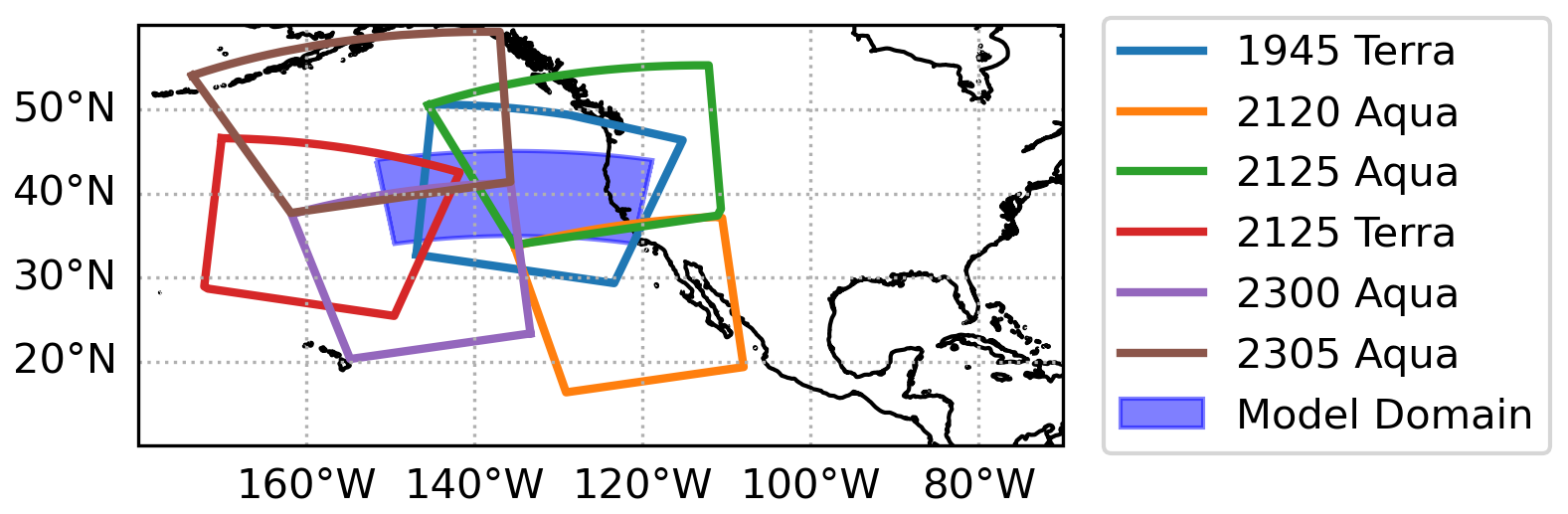 Figure 1Granules from Aqua and Terra overpasses on 12 July 2018 that intersect with the model domain of this study.
