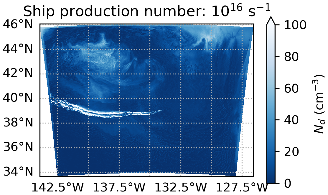 Reduction of our ship production number to 5 × 1014 s−1, produces only a 200 cm−3 aerosol perturbation, but recovers Nd that match much closer to observations. This artificial reduction in ship production number is necessary to obtain more realistic ship tracks (without the splitting effect), but we must verify whether or not the resultant enhancements in these ship tracks is as expected based on observations. Using Eq. (2), we calculate expected enhancements (ϵN) based on the background Nd as a function of aerosol mass emission rates. Using our ship production of numbers of 1016 and 5 × 1014 s−1, and a mean aerosol mass of kg, we obtain mass emissions rates of and kg s−1, respectively.