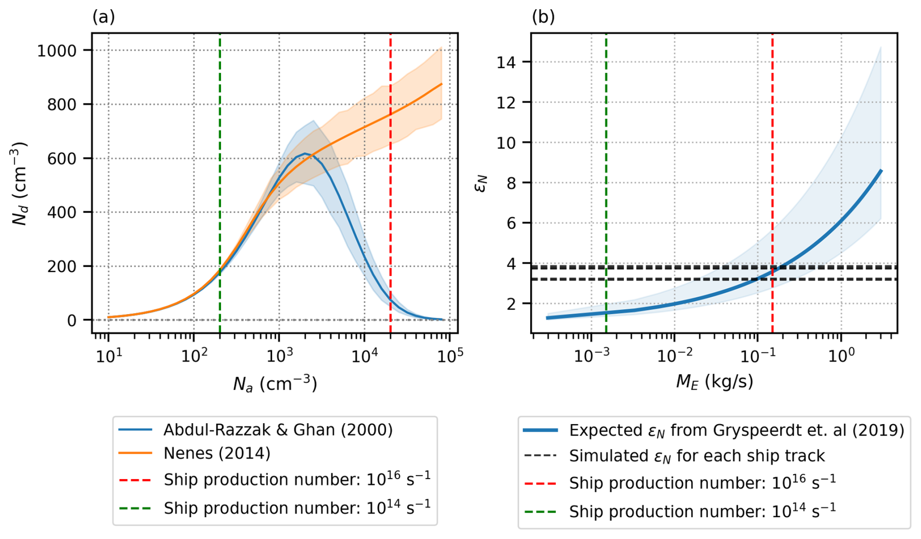 Figure 3(a) Number of aerosol particles (Na) activated to cloud droplets (Nd) in different activation parameterisations calculated in a simple adiabatic cloud parcel model. Confidence intervals given by the range of temperature, pressure and updrafts simulated in our case study. (b) The expected enhancement in cloud droplets (ϵN) as a function of aerosol mass emission rate (ME), based on Eq. (1) from Gryspeerdt et al. (2019b). Vertical lines are the emissions from different ship production numbers. Horizontal lines are the enhancements produced from our simulations for each individual ship. Confidence interval is given by the range of background droplet number concentrations in our simulation.