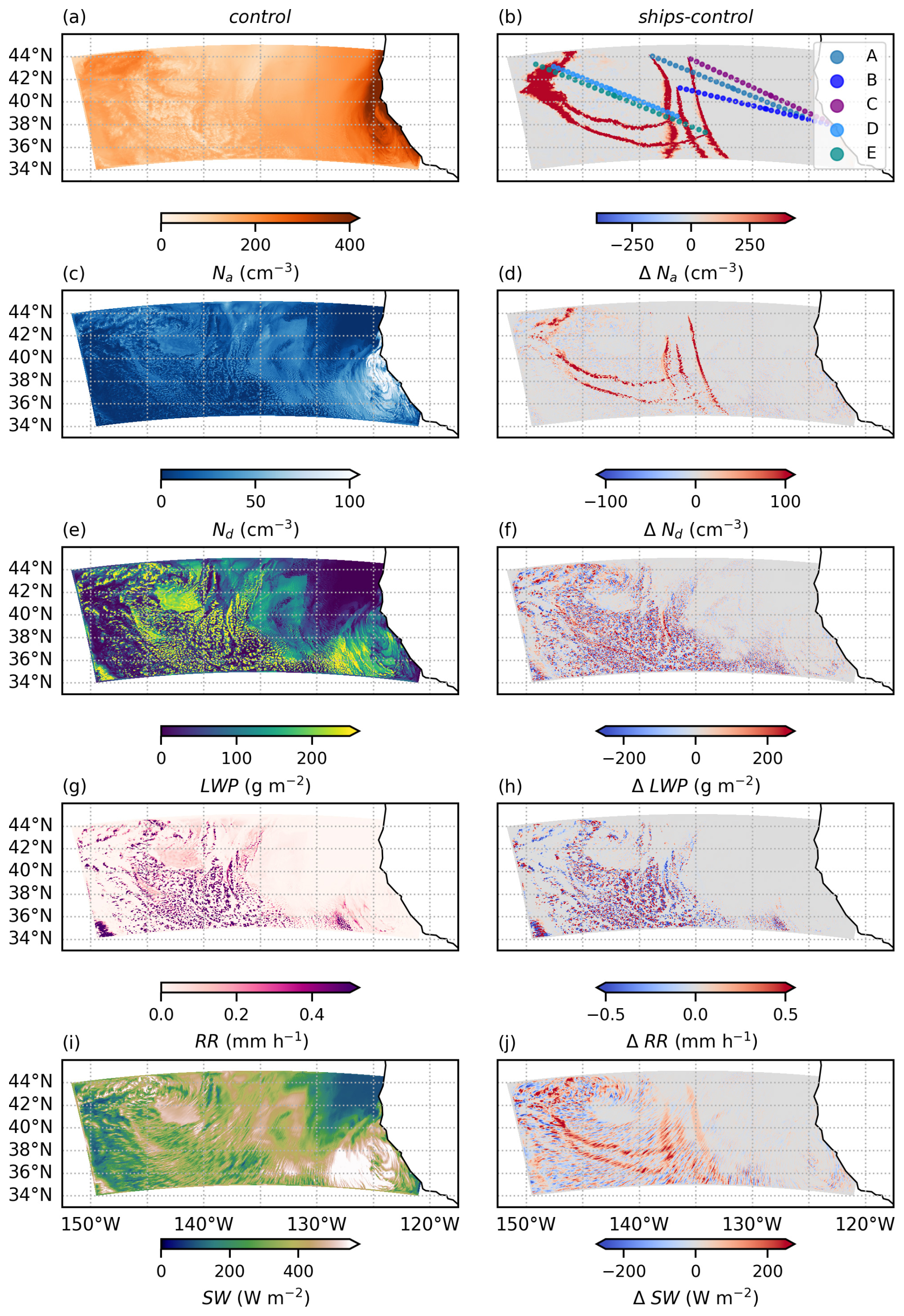 Figure 4Left column: control simulations of 12 July 2018 at 20:00Z without ship emissions turned on. Panel (b) contains the locations of the ships simulated during this study, up until the time step of this figure. Right column: difference from control for simulation with shipping emissions on. Stochastic noise between two model runs can be seen in the difference plots. Variables shown are aerosol number concentration (Na), cloud droplet number concentration (Nd), liquid water path (LWP), surface rain rate (RR), and top of atmosphere outgoing short wave radiation (SW). Nd and Na are mean values across model level numbers below 1 km.