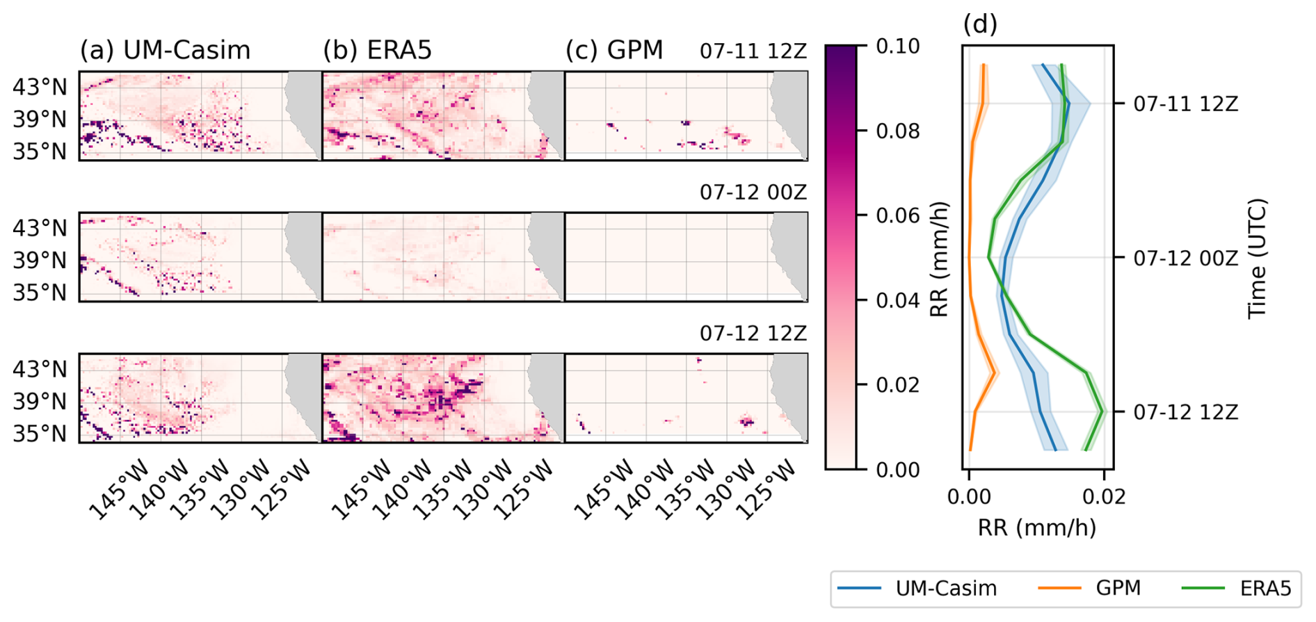 Evidently, this evaluation demonstrates that there is some uncertainty in the simulated precipitation within our domain, as well as within the observed precipitation. The UM-CASIM precipitation falls between what is predicted from ERA5 and GPM, with different CloudSat products giving largely different precipitation rates. More generally, double moment CASIM is shown to have increased skill at representing precipitation in a frontal system over the UK, and a tropical storm in Darwin (Field et al., 2023), as compared to other model microphysics schemes (evaluated against GPM and radar), however there are still limitations in its representation of moderate precipitation, in the range of 4–16 mm h−1 (Bush et al., 2025).