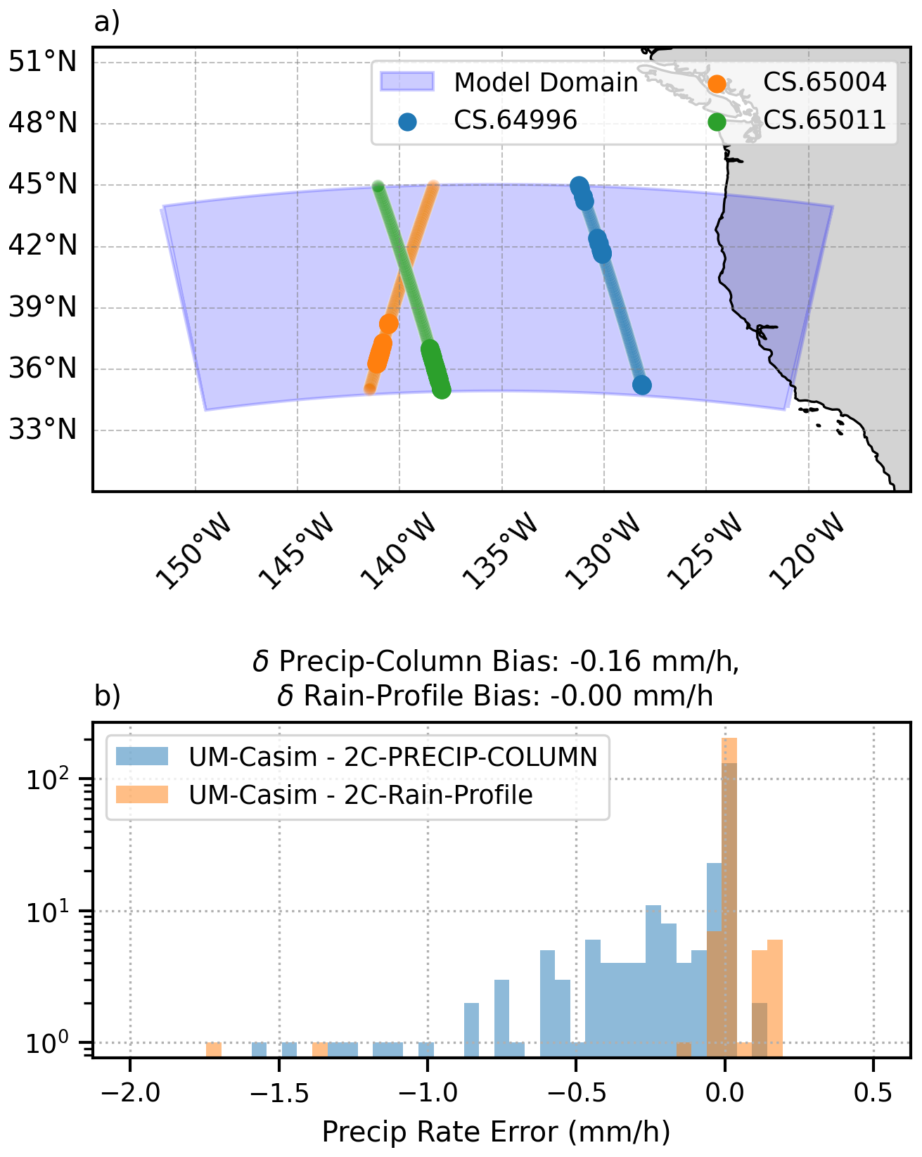 There are 3 overpasses of this domain by the CloudSat Cloud Profiling Radar (CPR; Stephens et al., 2008; Tanelli et al., 2008) during our simulation run. Figure 6a shows the location and presence of surface precipitation (in the 2C-Precip-Column product; Haynes et al., 2009) in these overpasses. There is significant disagreement in between the 2C-Precip-Column and 2C-Rain-Profile (L'Ecuyer and Stephens, 2002) products from the CPR, with UM-CASIM underestimating precipitation along this overpass when compared to 2C-Precip-Column, and having a small mean bias when compared to 2C-Rain-Profile.