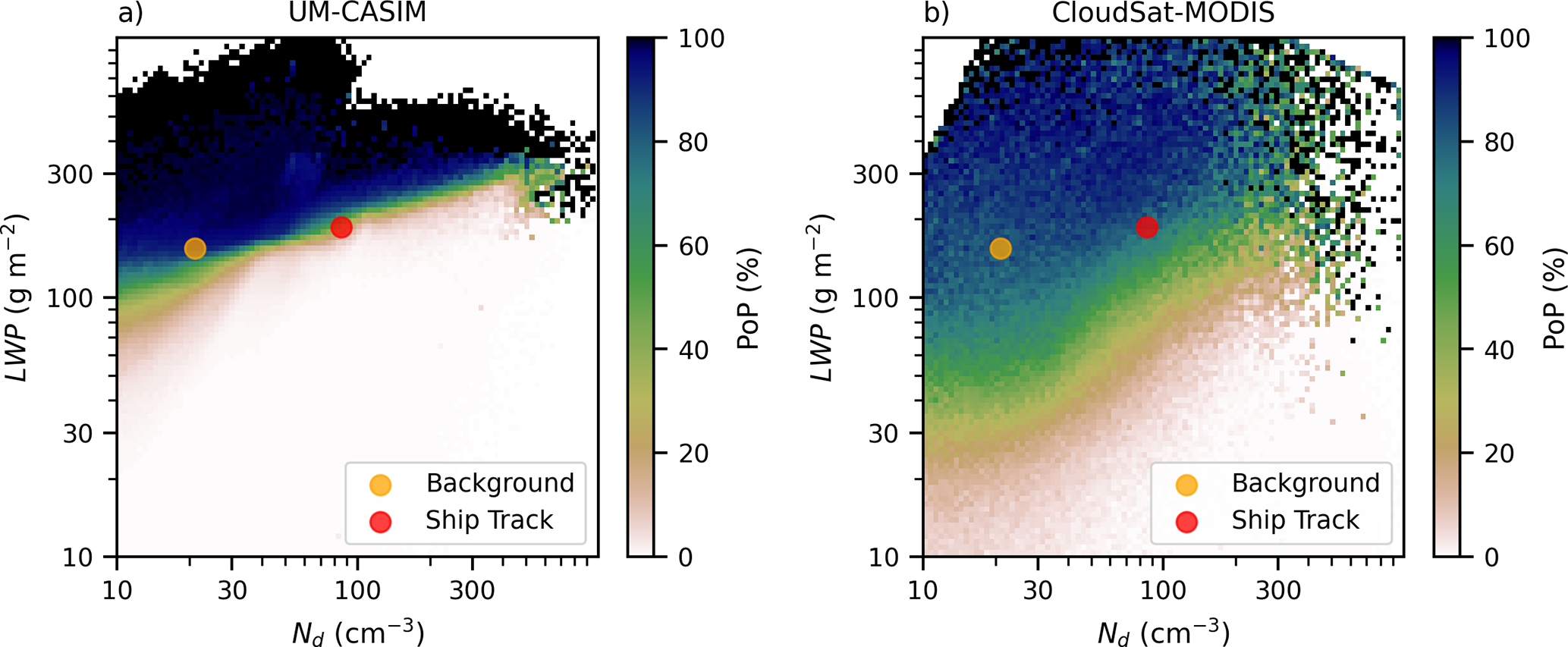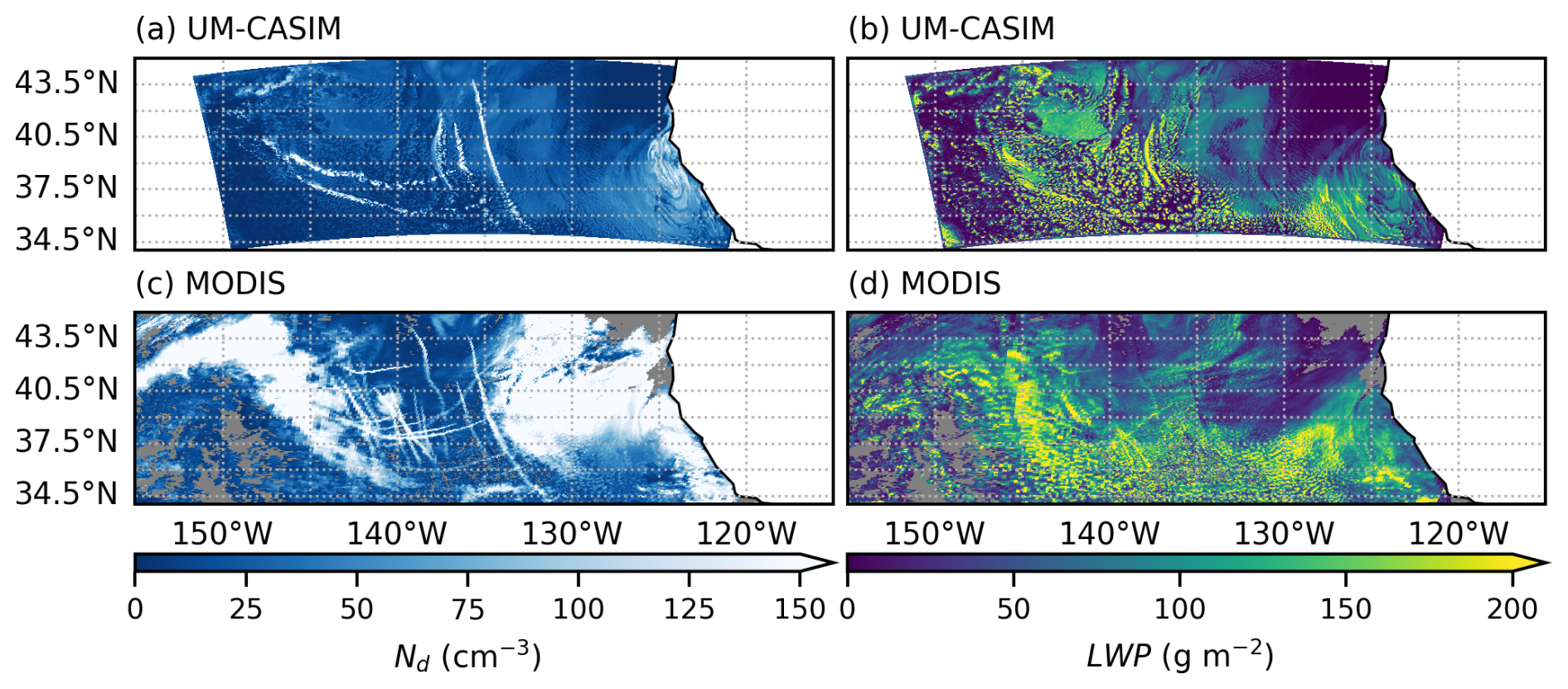 Previous efforts have been made to simulate ship tracks in atmospheric models, in order to assess model performance (Wang and Feingold, 2009; Possner et al., 2015, 2018; Berner et al., 2015; Chun et al., 2023). Berner et al. (2015) and Wang and Feingold (2009) utilise fine resolution LES models to investigate the effect of aerosol perturbations on marine stratocumulus, but cannot make direct comparisons to observations since they are not real cases of ship tracks. Similarly, McMichael et al. (2024, 2025) investigate ship track spreading rates with LES, and Prabhakaran et al. (2024) use LES to investigate impacts on the stratocumulus-to-cumulus transition. Possner et al. (2015) use observations of a real case of ship tracks, yet the simulated ship locations are not from the actual ships that caused the observed ship tracks, which limits the ability to assess the accuracy of MCB simulations. Additionally, whilst previous studies have typically attempted to quantify the Nd response, relatively few have sought to investigate the simulated representation of the LWP adjustment.