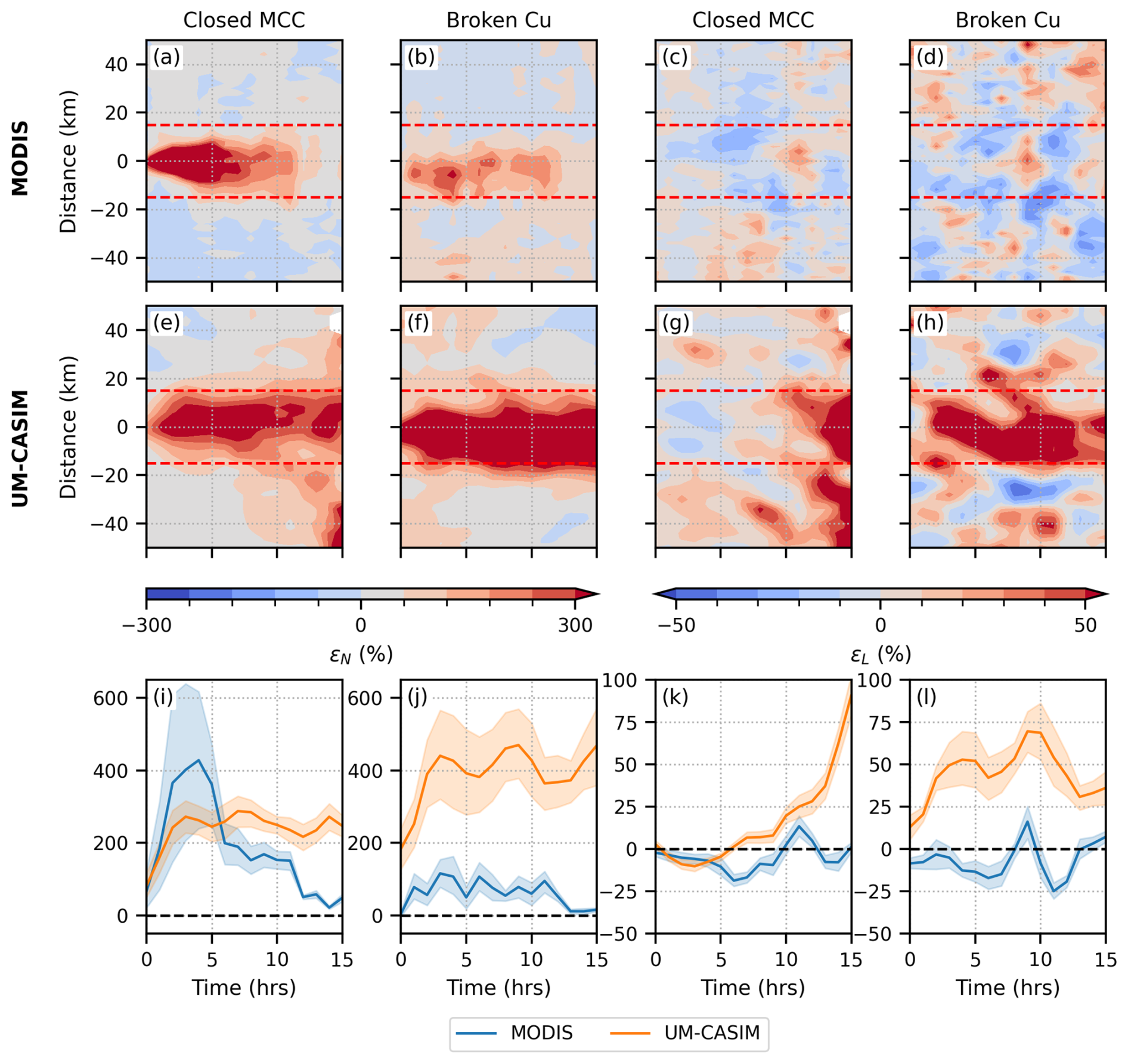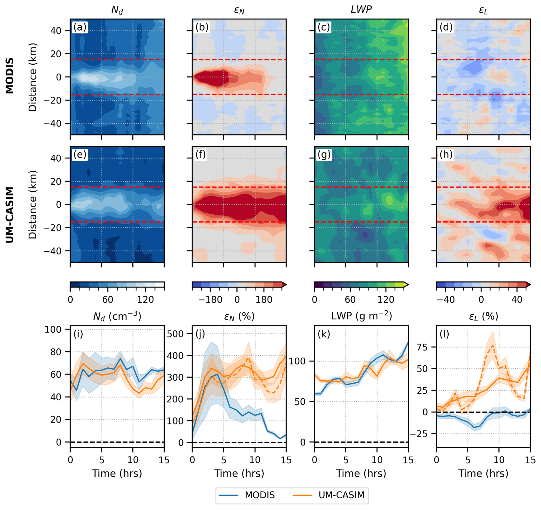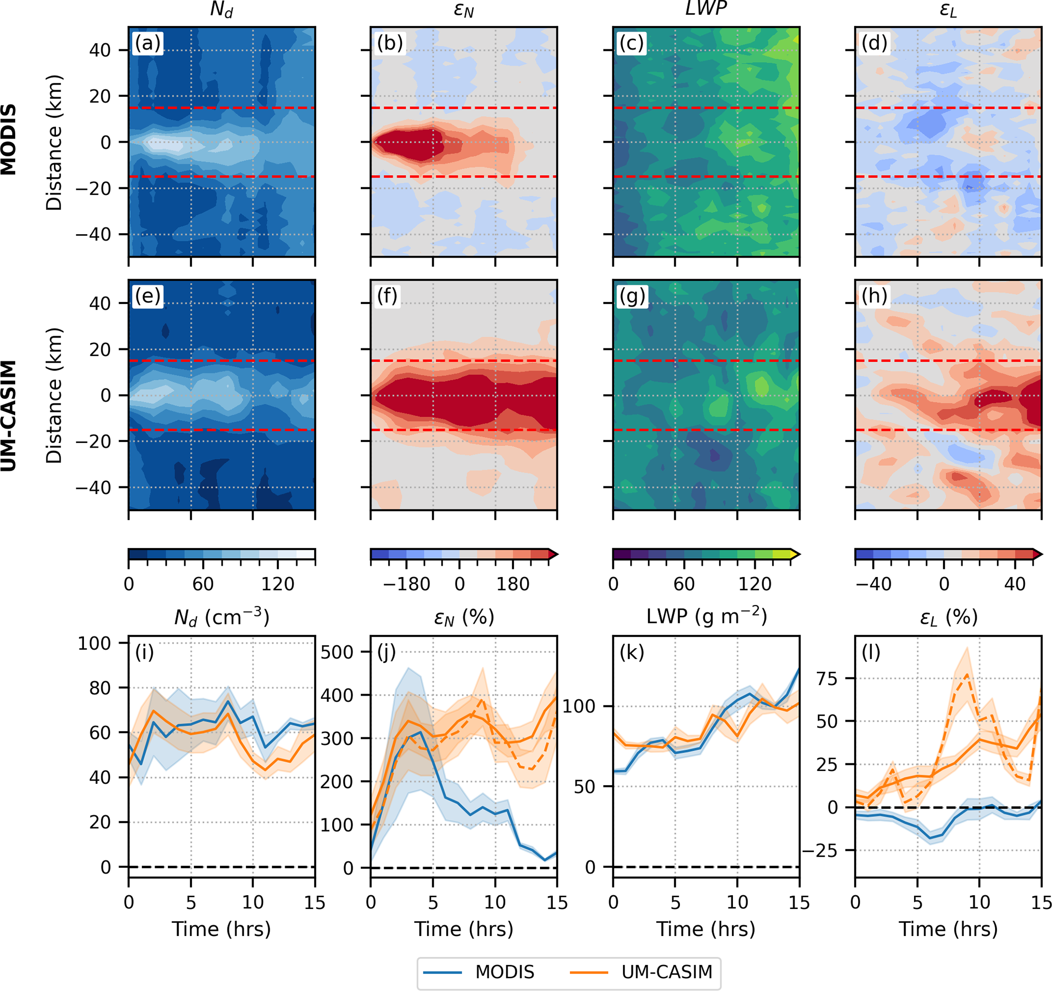 Similarly, for the LWP enhancements we see distinctly different responses. In the observations we see the response typically associated with ship tracks in non-precipitating environments, with a decrease in LWP in the first 5 h, which then returns to zero. Conversely, in the modelled ship track we see only a blanket increase in LWP which increases over time. Figure 8k demonstrates that the absolute inside track LWP values are similar, therefore this difference in enhancement must stem from the model representation of the control/background state, and the sensitivity of the model to changes in Nd.