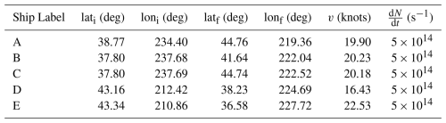 In order to simulate the shipping impacts on clouds, we add five ships to our simulation in our ships run. We use container ship locations identified in AIS data and matched to observed ship tracks from 11–12 July 2018, to add realistic moving sources of aerosol (Smith et al., 2015). Details of ship start/end positions and velocities can be found in Table 1. Container ships are selected because of their large size and high emissions, meaning that the resulting ship tracks are the most distinct in the observations. Our five selected ships also cover both directions of the shipping route within the domain. Aerosol is added in a model level at 10 m above sea level and immediately dispersed throughout the 1.5 km by 1.5 km grid box using the following equation: