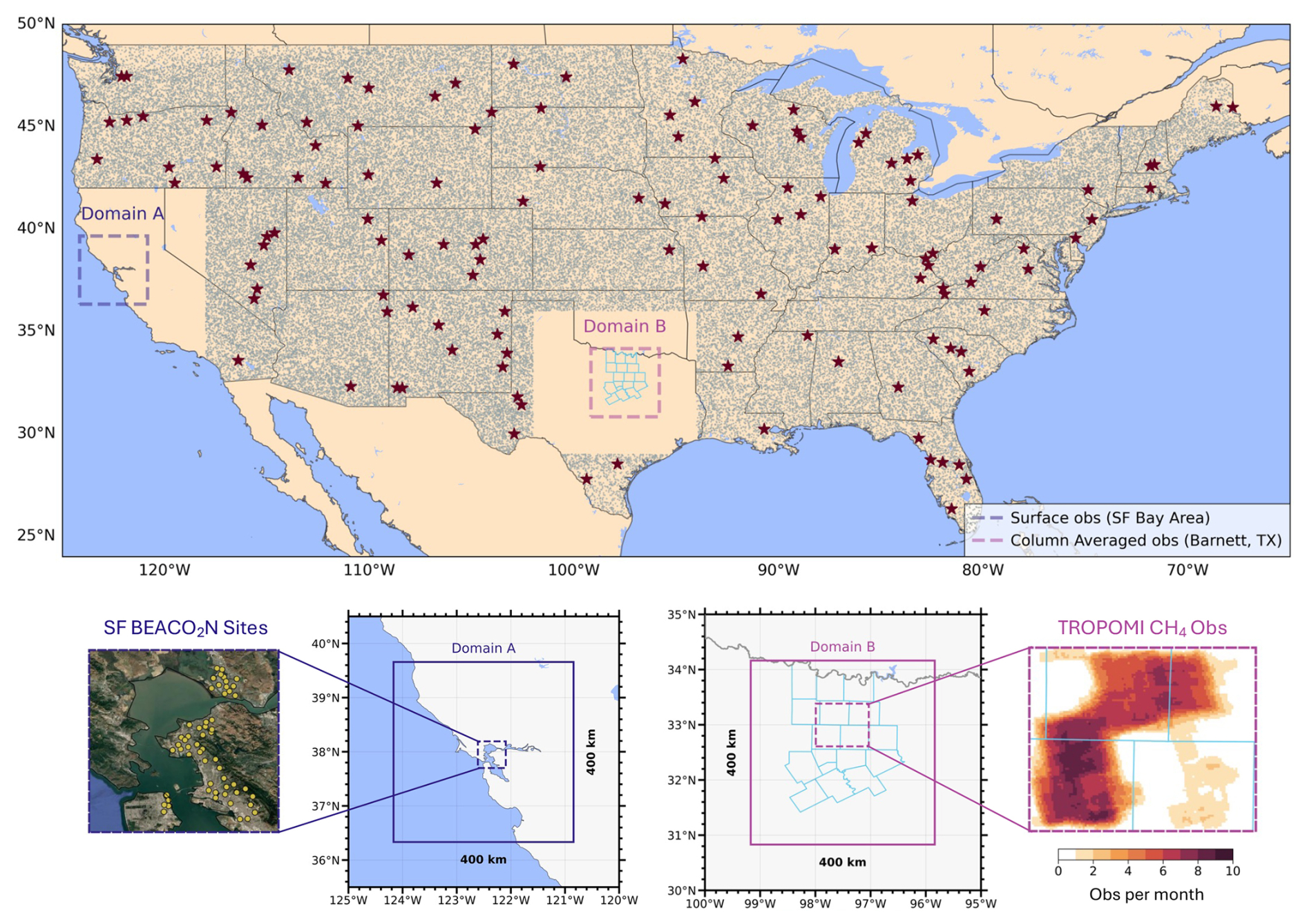 Figure 2(Top panel) Receptors for training out-of-sample FootNet. Gray dots indicate individual receptors sampled uniformly across CONUS. Red stars show centers of 400 × 400 km2 subdomains with enhanced temporal sampling. Domains A and B are withheld in the out-of-sample training configuration. Figure S1 in the Supplement shows the full training data used for the in-sample FootNet model. Bottom row shows the observational networks used in both case studies. The blue boundaries in Domain B show counties in the Barnett Shale basin. Background satellite imagery is taken from © Google Maps.