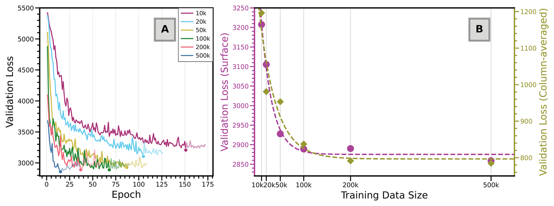 Figure 3Training set size versus model performance. (A) Evolution of validation loss for surface footprint models trained with different dataset sizes. (B) Minimum validation loss for surface and column models as a function of training set size. Results shown are for a single random seed.