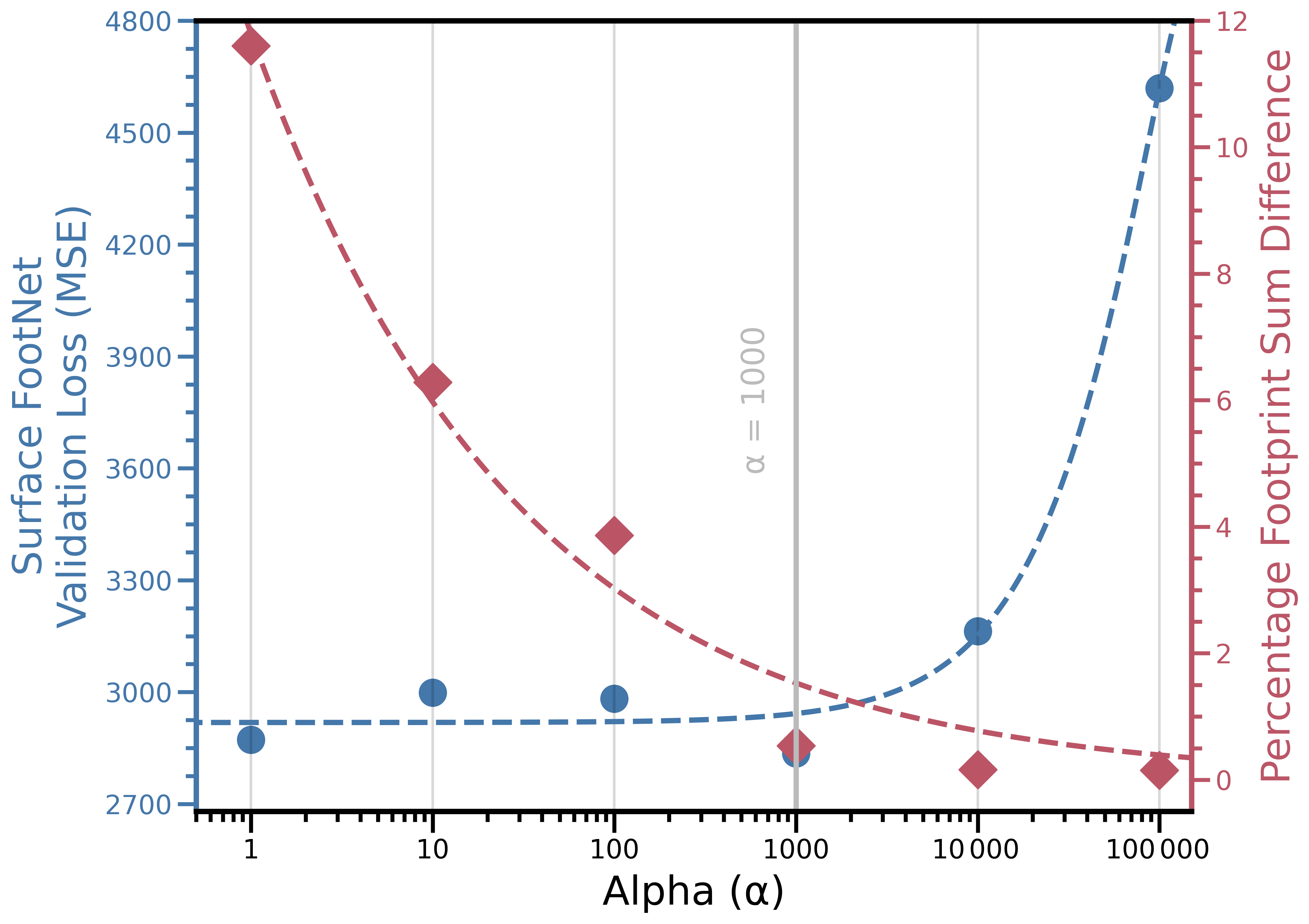 Figure 4Trade-off between validation loss (mean squared error; MSE) and percentage footprint sum difference for different values of α in the surface FootNet model.