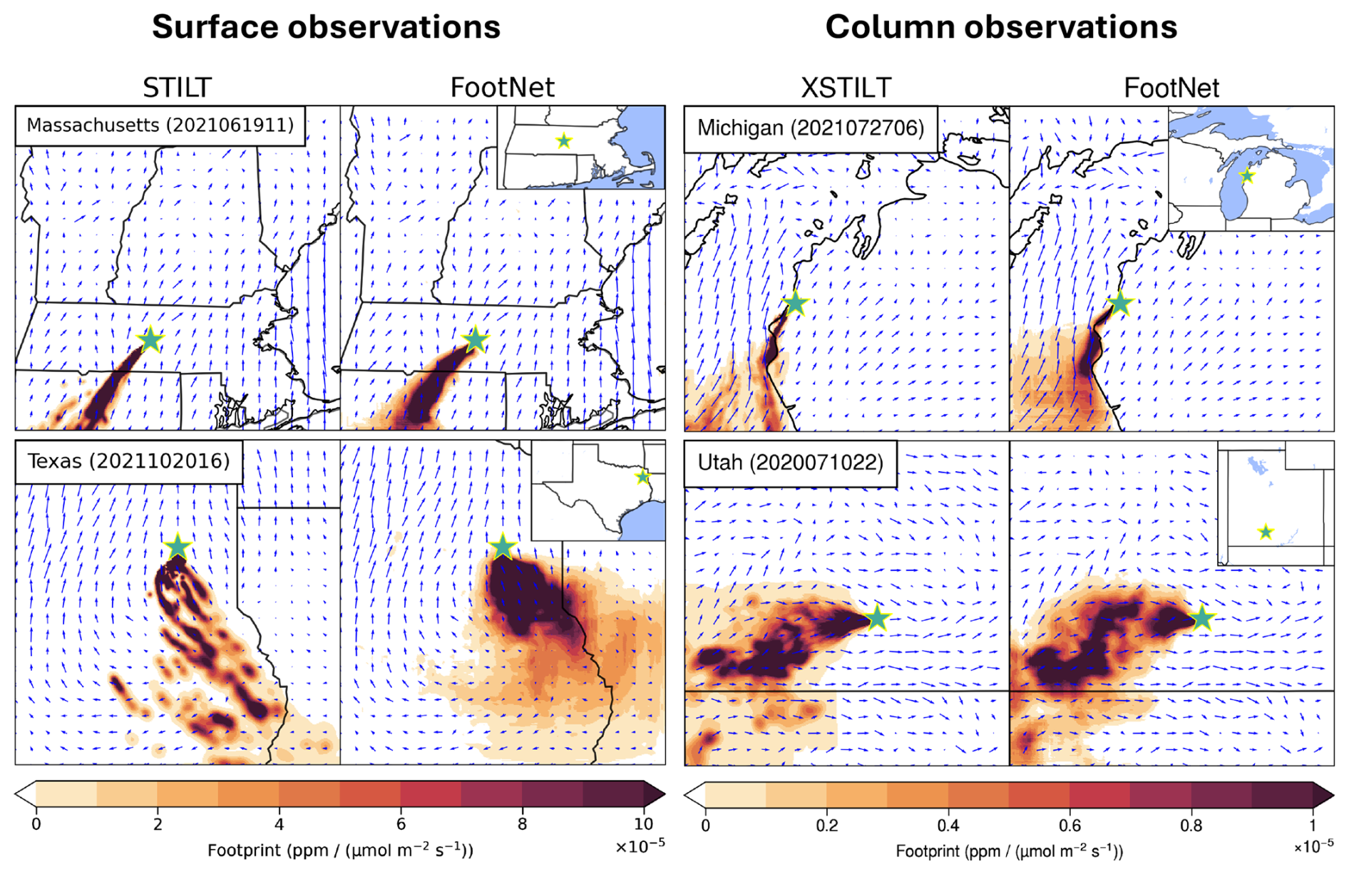 To evaluate how well FootNet generalizes across space and observation type, we compare predicted footprints against STILT and X-STILT outputs in regions and conditions not used during training. Figure 5 shows representative examples drawn from the independent test set, including surface and column-averaged footprints across a range of meteorological states. In each case, FootNet captures the dominant spatial structure of the reference footprint, including the directionality imposed by wind fields and the localization associated with boundary layer mixing. For example, in Massachusetts, the model reproduces a classic Gaussian plume aligned with surface winds for a hypothetical surface observation. In Michigan, we can see that the X-STILT column footprint hugs the shoreline of Lake Michigan and FootNet reproduces this complex spatial pattern with high fidelity. Similarly, a column example from Utah shows a complex footprint shaped by topography and mesoscale flows, which is well-approximated by FootNet. In Texas, the large-scale flow is consistent between FootNet and STILT, but STILT exhibits sharper, more localized structures, whereas FootNet yields a smoother footprint. While STILT's spatial structure is more physically realistic (as it directly solves the governing equations), it is not necessarily more accurate due to potential biases in the driving meteorological fields. Highly localized but biased footprints could introduce artifacts in GHG flux inversions. In this context, the smoother prediction from FootNet may actually be preferable. However, it is important to note that FootNet is trained on STILT and X-STILT. As such, the improved performance against independent atmospheric observations implies that the smoothness is mitigating underlying model errors. We also note that other approaches have been developed to mitigate transport errors within physics-based models and inversion frameworks. For example, incorporating stochastic wind uncertainties to enhance dispersion (Lin and Gerbig, 2005), and explicitly accounting for correlated transport errors over the footprint duration (Jones et al., 2021). Overall, Fig. 5 shows that FootNet reproduces footprints with high fidelity across a wide range of conditions.
