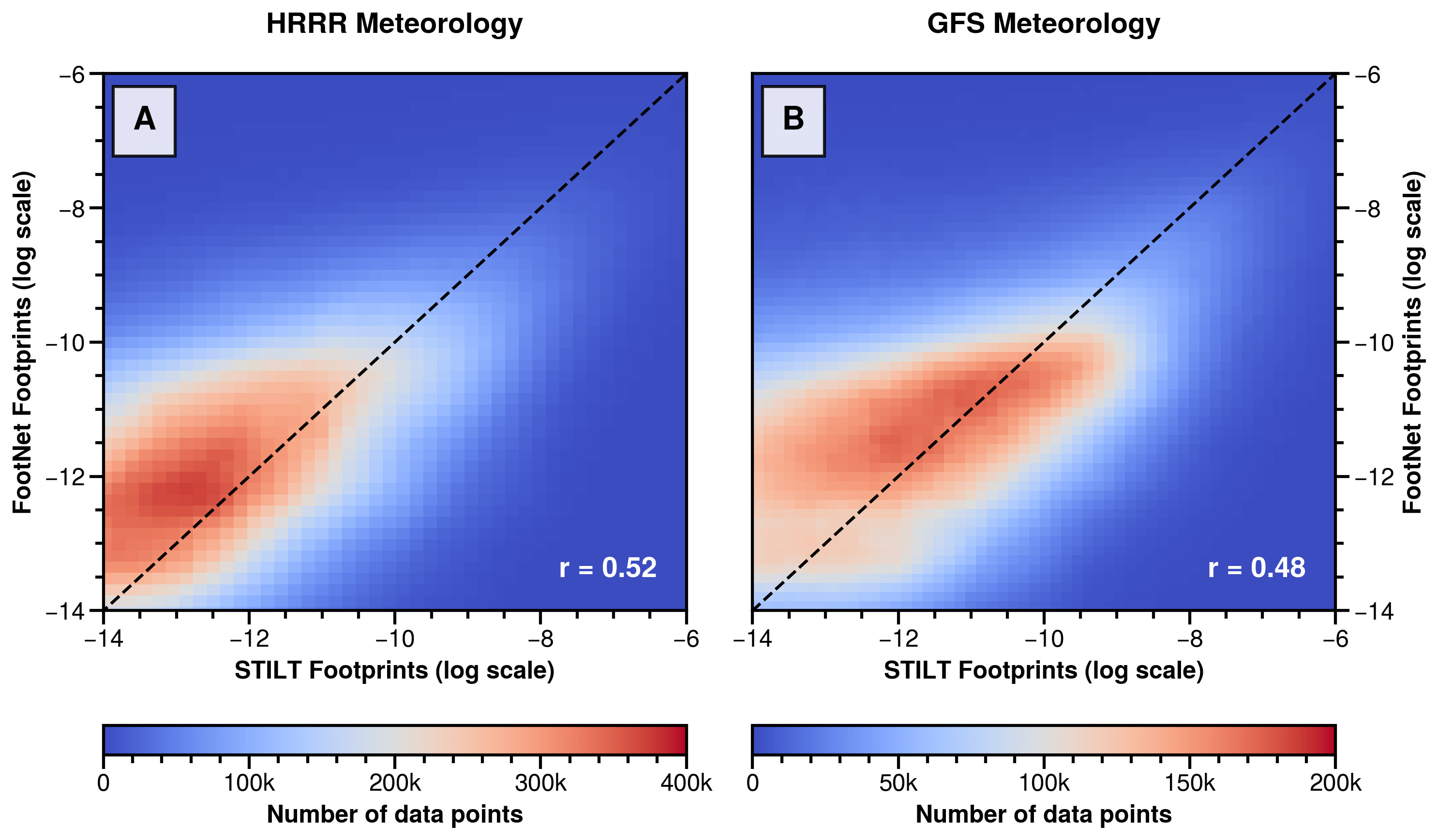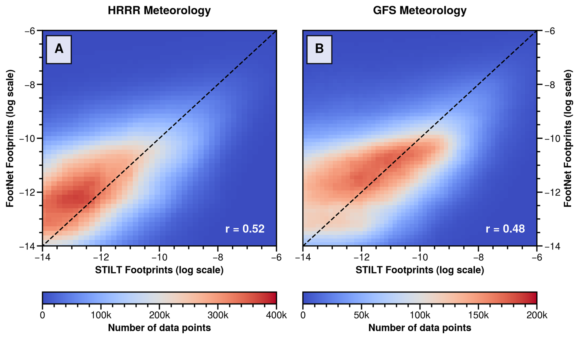 Figure 6Comparison between FootNet and STILT footprints using different meteorological inputs. The x-axes show STILT-simulated footprint values using HRRR (left) and GFS (right) meteorology. The y-axes show corresponding FootNet predictions using the same meteorological inputs. FootNet was trained exclusively on HRRR data and has never seen GFS meteorology. All predictions are made at the same receptor locations and compared against independent test footprints withheld from training. Each data point in the plot represents a non-zero influence pixel from one of the 5000 randomly sampled footprints in the test set. The unit of the footprints is ppm (µmol m−2 s−1)−1.