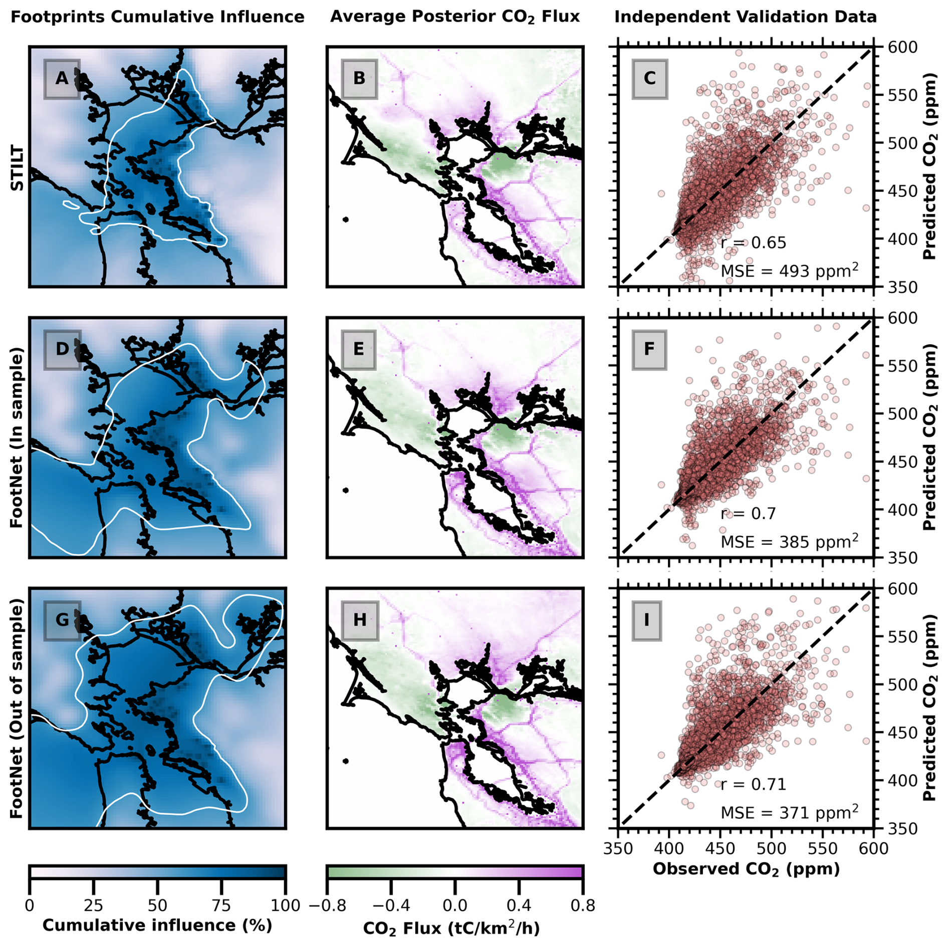Figure 7CO2 inversion results in the San Francisco Bay Area using STILT, in-sample FootNet, and out-of-sample FootNet footprints. (Left column) Cumulative footprint influence. (Middle column) Posterior CO2 flux inferred from the BEACO2 network. (Right column) Comparison of observed and simulated CO2 concentrations from an independent test set using the corresponding posterior fluxes. Observations were drawn using a consistent seed across experiments. White contours in the left column represent the 60th percentile of the cumulative footprint influence. The percentage cumulative influence is relative to the cumulative footprint sum for each grid point.