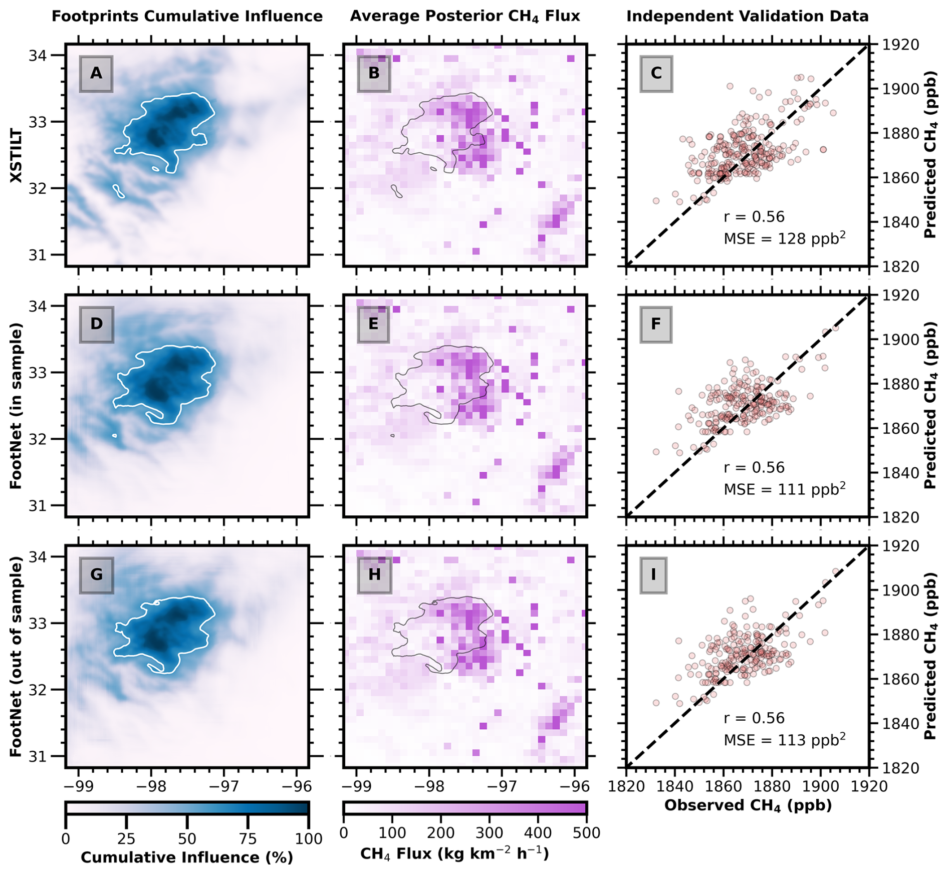 Figure 8Methane inversion results in the Barnett Shale, TX using X-STILT, in-sample FootNet, and out-of-sample FootNet footprints. (Left column) Cumulative footprint influence. (Middle column) Posterior methane flux inferred from the TROPOMI observations. (Right column) Comparison of observed and simulated methane concentrations from an independent test set using the corresponding posterior fluxes. Observations were drawn using a consistent seed across experiments. White contours in the left column represent the 60th percentile of the cumulative footprint influence. The percentage cumulative influence is relative to the cumulative footprint sum for each grid point.
