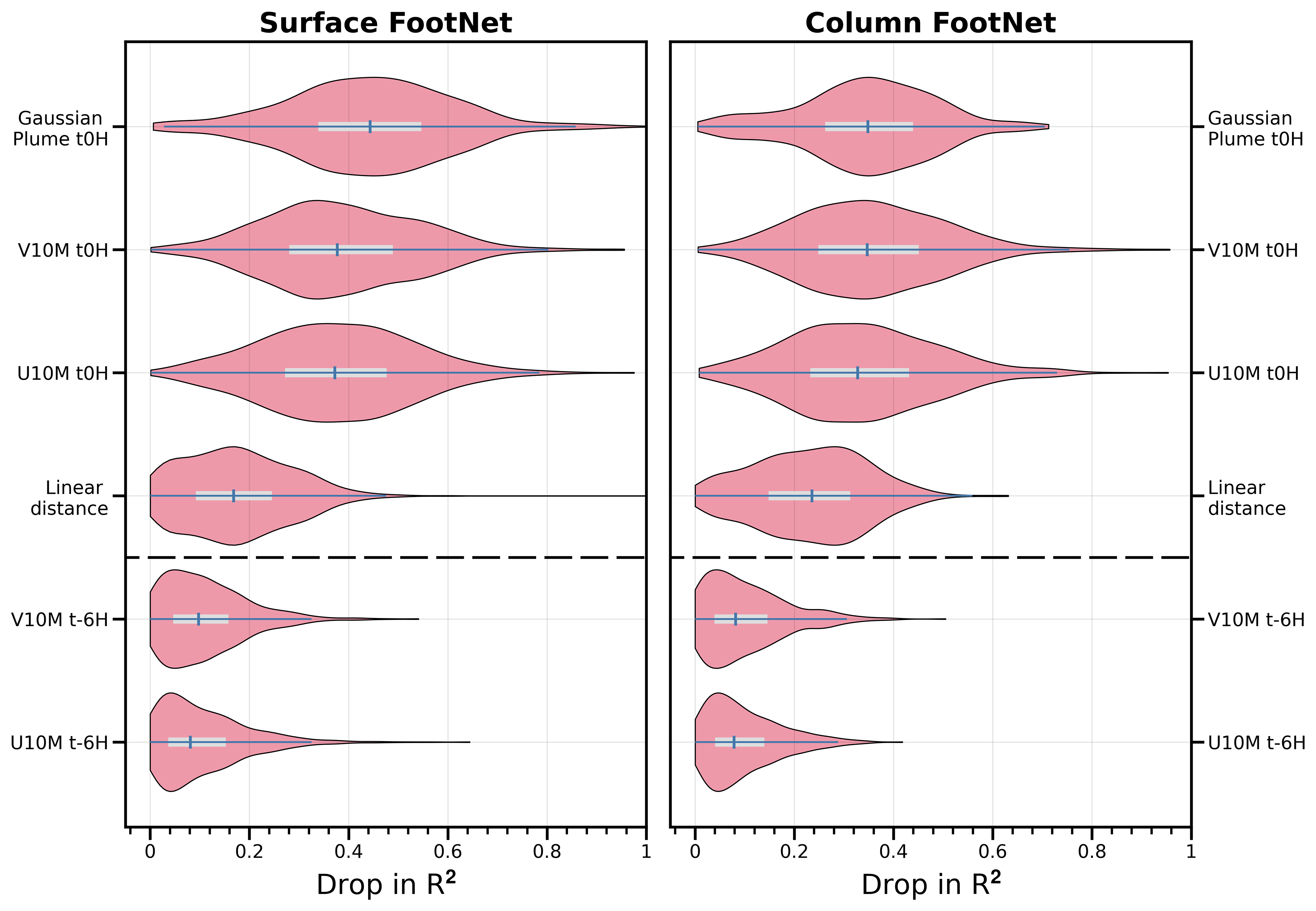 To identify which inputs contribute most to model predictions, we applied the Permute-and-Predict (PaP; Fisher et al., 2019) method to 5000 examples from the test set. The PaP method estimates the feature importance by measuring the drop in model performance when each input feature is randomly shuffled within a sample. A greater drop in performance indicates the higher importance of that feature to the model. This approach reveals the relative importance of each input to footprint prediction. Figure 9 shows the six most influential features for both surface and column models. In both cases, the Gaussian plume proxy is the top feature. This synthetic field encodes a directional prior based on surface winds and provides a strong initial guess of footprint location and spread. Zonal and meridional wind components at the time of observation also rank highly, consistent with their role in advecting plumes.