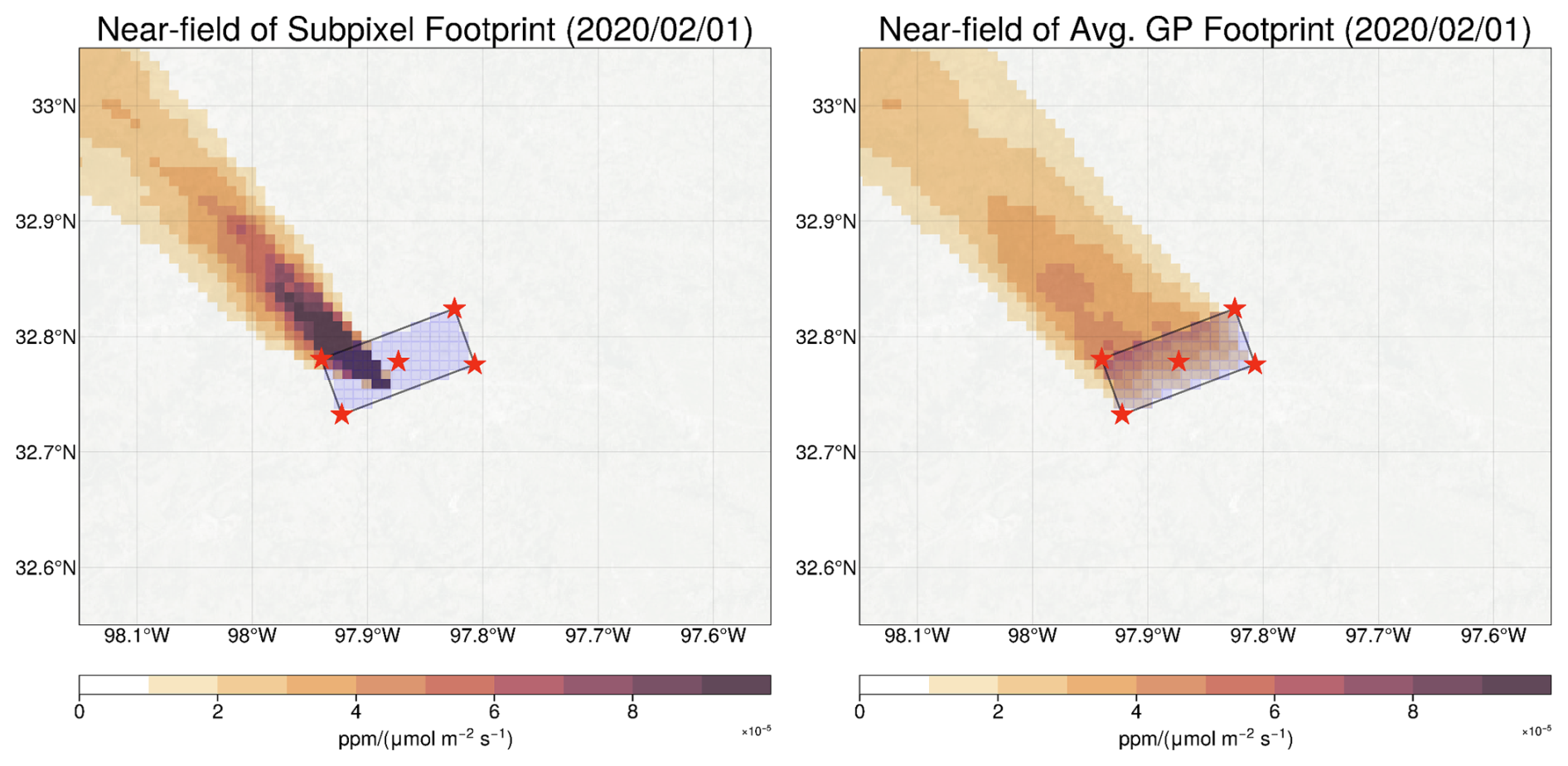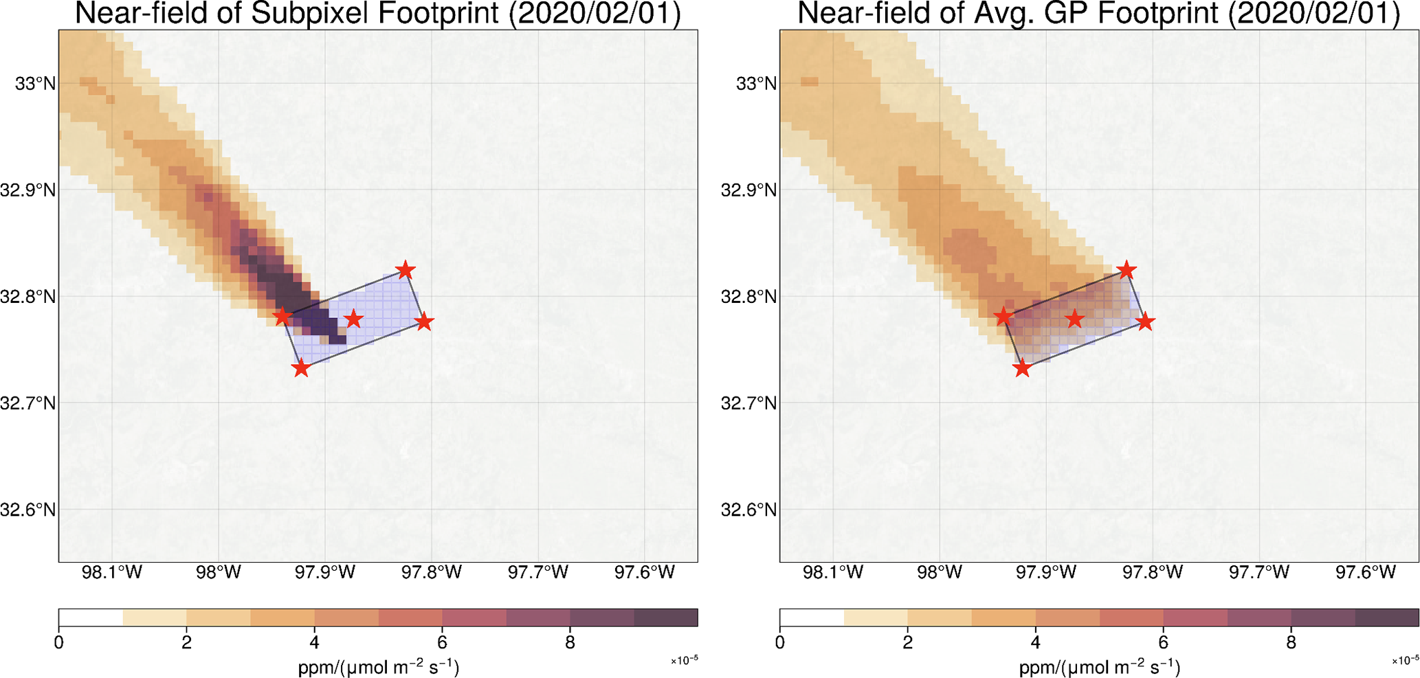 Figure A1Construction of the TROPOMI footprint at 1 × 1 km2 spatial resolution. Red stars indicate the bounding box and center of the TROPOMI pixel. Light blue boxes are 1 × 1 km2 grid cells within the TROPOMI bounding box. Left panel shows a X-STILT footprint for a single 1 × 1 km2 subpixel within the TROPOMI bounding box. Right panel shows the average footprint for all subpixels within the TROPOMI bounding box. The average footprint gives a lower maximum sensitivity but distributes it over a wide region. We also observe a gradient across the TROPOMI bounding box with increased sensitivity on the upwind (Northern) edge.