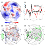 The upper-level anomalies influence MSLP, with the MSLP distribution in Fig. 8c characterized by a high-pressure anomaly over most of the Antarctic continent and large parts of the Southern Ocean, exceeding 1 hPa over most of East Antarctica and western Amundsen Sea. Low-pressure anomalies occur over the Antarctic Peninsula and surrounding seas, as well as over the western Pacific sector. The negative anomalies of MSLP have smaller magnitudes than the positive anomalies. The pressure anomalies drive wind anomalies (Fig. 8d), with strong southerly wind anomalies over the Bellingshausen Sea and around the Antarctic Peninsula. These result in lower temperatures, promoting fast-ice expansion. In contrast, the Amundsen Sea lies between two low-pressure centers under a high-pressure ridge, where divergent winds induce fast ice fracturing. However, lower temperatures in this region simultaneously favor fast ice retention, leading to a large variability in fast ice coverage. Over the Weddell Sea, northerly wind anomalies dominate, inhibiting fast ice preservation and resulting in reduced coverage (Fig. 2e). In the Atlantic and western Indian Ocean, zonal easterly winds prevail, causing fast ice variability to depend heavily on topography and wind convergence/divergence.