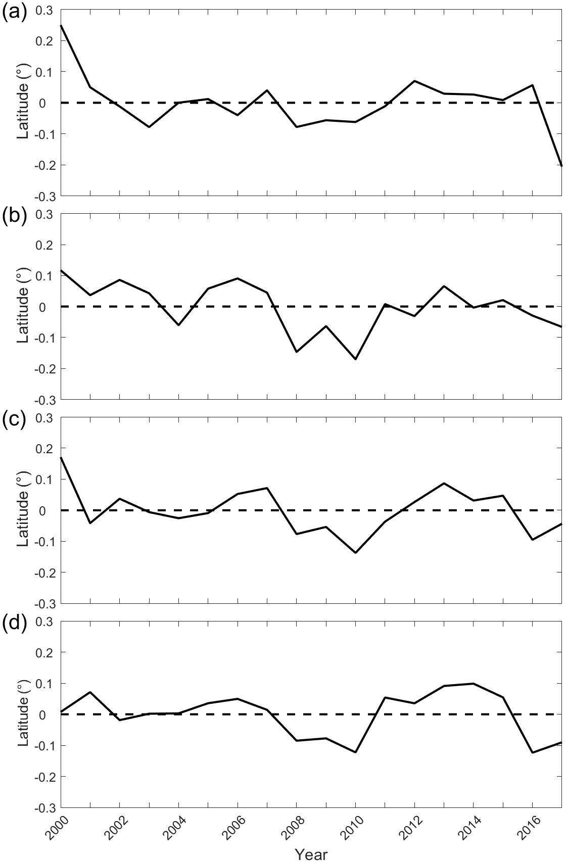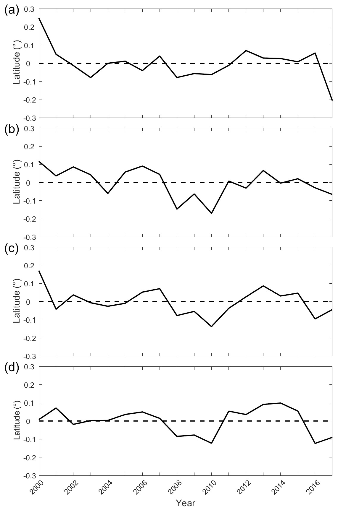 Figure 1Time series of fast ice extent anomaly (offshore differences in latitude): (a) autumn, (b) winter, (c) spring, (d) summer.