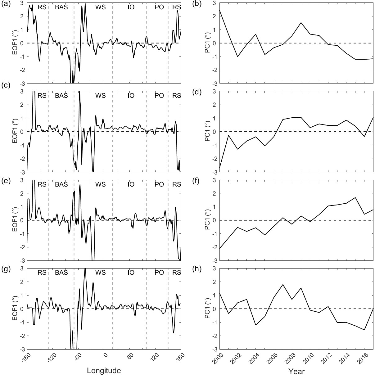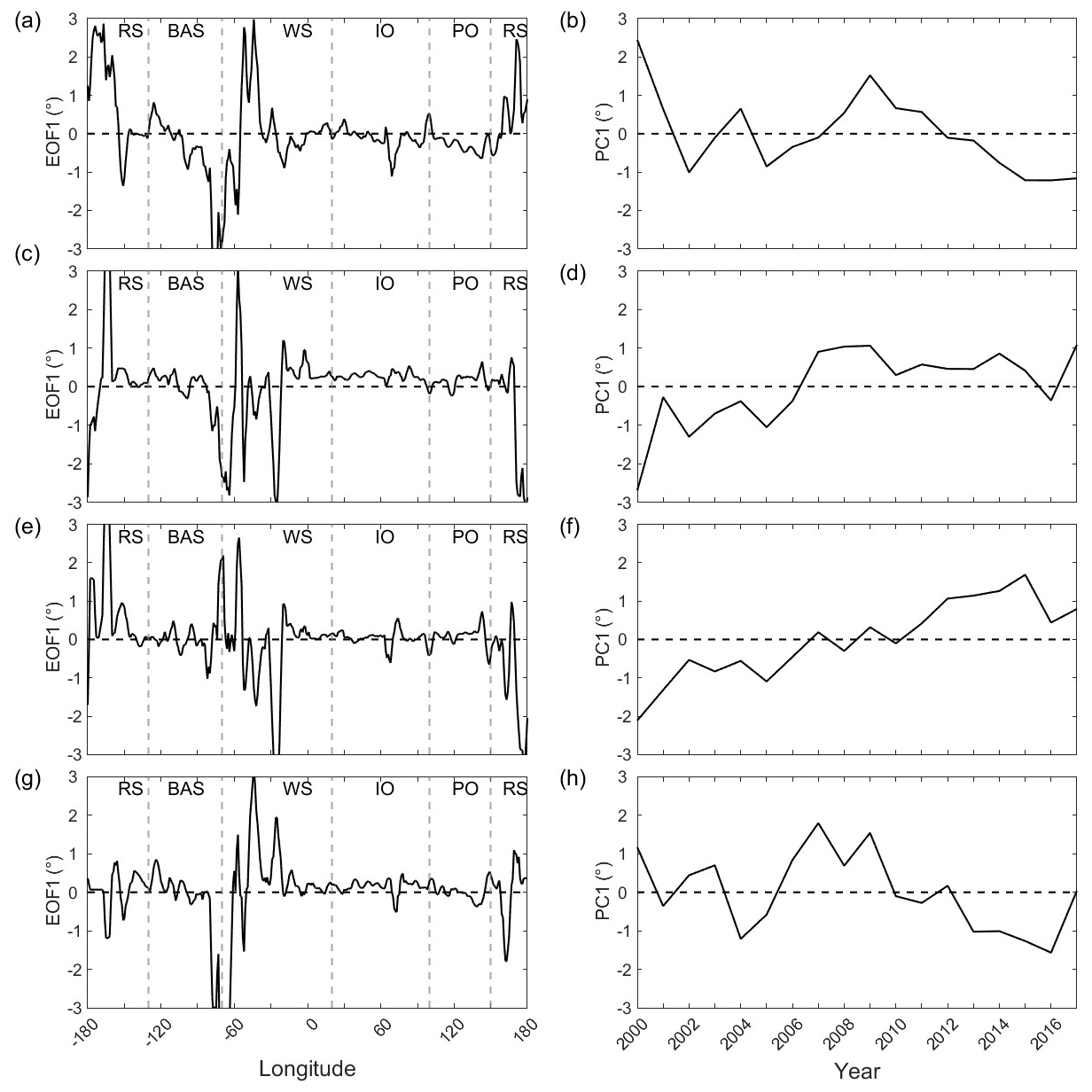 Figure 2The EOF1s and PC1s of first EOF mode of Antarctic fast ice extent anomalies (2000–2018) for each season: (a) spatial pattern (EOF1) during autumn, (b) temporal principal component (PC1) during autumn, (c) EOF1 during winter, (d) PC1 during winter, (e) EOF1 during spring, (f) PC1 during spring, (g) EOF1 during summer, (h) PC1 during summer. In the figure, RS refers to the Ross Sea, BAS refers to the Bellingshausen Sea and Amundsen Sea, WS refers to the Weddell Sea, IO refers to the Indian Ocean, and PO refers to the Pacific Ocean.