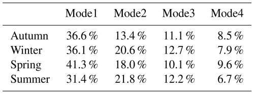 We also conducted a correlation analysis on the spatial modes of each season. The spatial modes between winter and spring show good correlation, with a correlation coefficient of 0.72. There is also a certain degree of correlation between summer and autumn, with a correlation coefficient of 0.47. The correlations are all statistically significant. However, the correlation coefficients between other seasons are minimal.