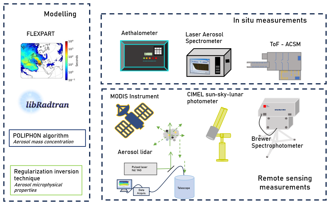 Figure 1Schematic overview of the instrumentation set-up used in this study. The figure illustrates the integration of multi-platform observations from the NTUA (lidar and photometer), DEM (air quality and aerosol composition), and BRFAA (Brewer spectrophotometer) stations, together with satellite observations (MODIS FIRMS), FLEXPART dispersion modelling, as well as the POLIPHON algorithm and the Regularization inversion technique, highlighting the synergistic use of active and passive remote sensing, in situ data, and modelling tools.
