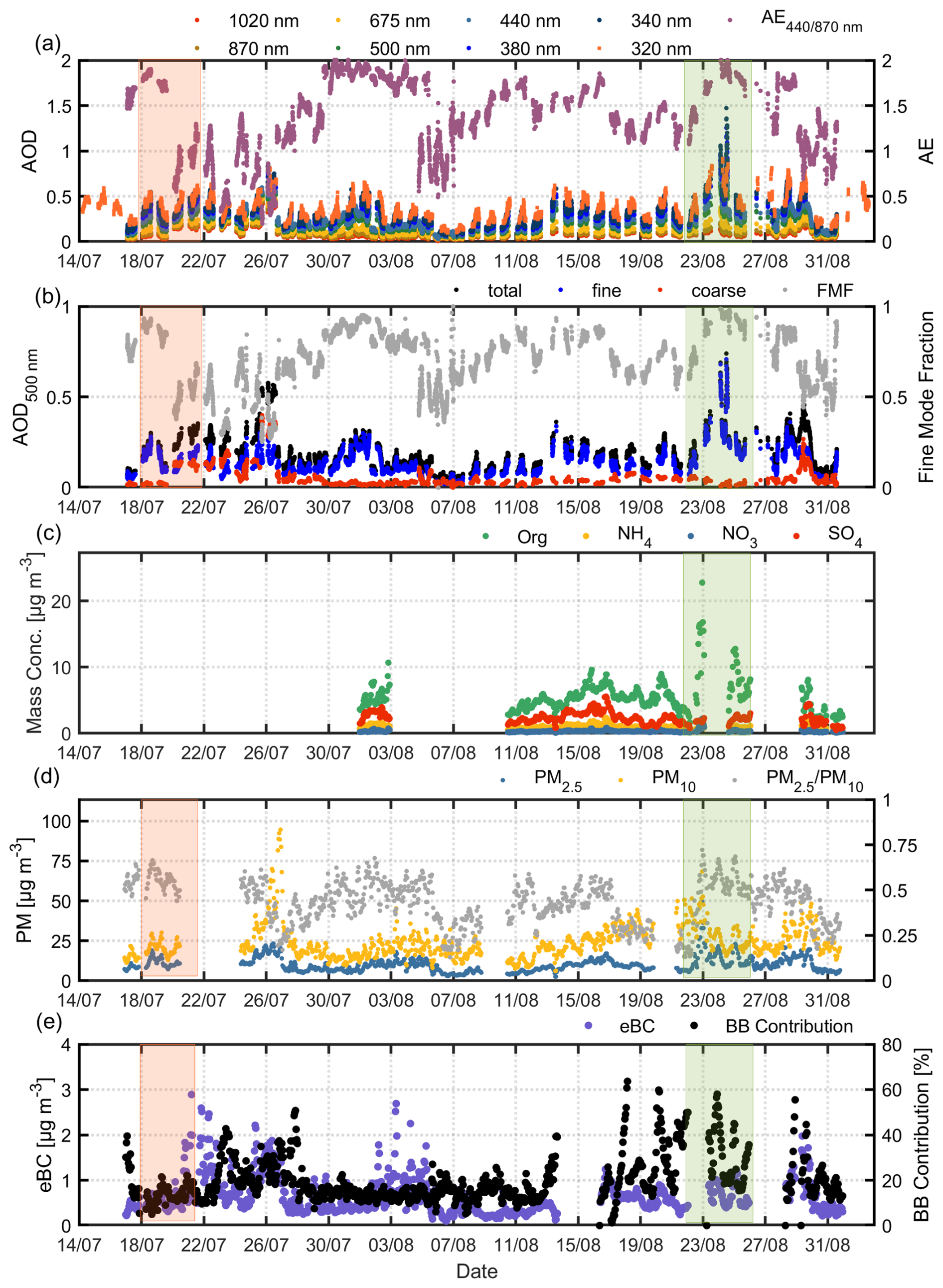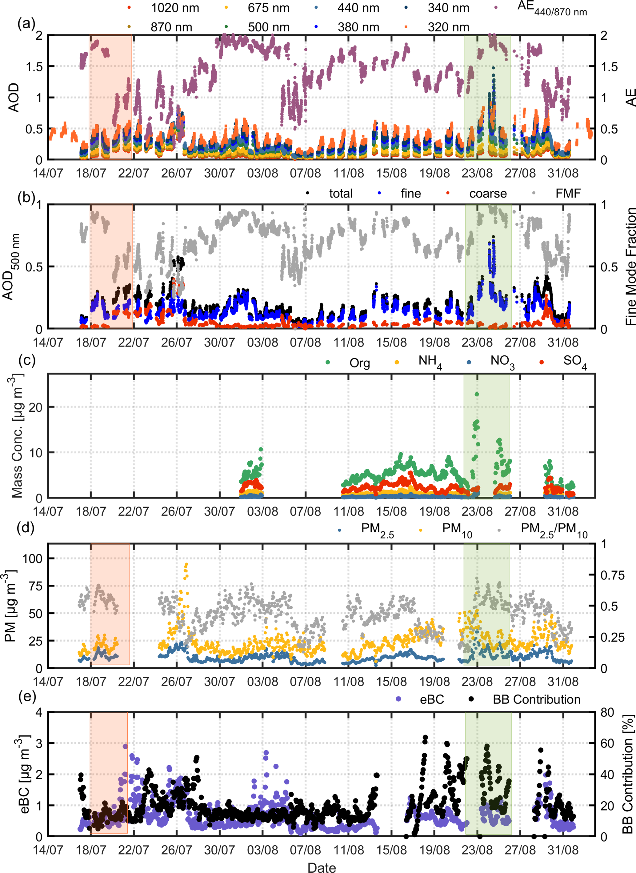 Figure 3Time-series of hourly averaged values of (a) AOD for various wavelengths (340–1020 nm) and AE at 440/870 nm obtained by the CIMEL sun-sky-lunar photometer and AOD at 320 nm obtained by the Brewer spectrophotometer (b) AOD and AE at 500 nm along with the Fine Mode Fraction (FMF) obtained by the CIMEL sun-sky-lunar photometer (c) mass concentration of various chemical composition (Org, NH4-, Cl, NO3-) obtained by ToF – ACSM (d) 1 h PM2.5 and PM10 concentration (e) eBC concentration and BB contribution obtained by the aethalometer.