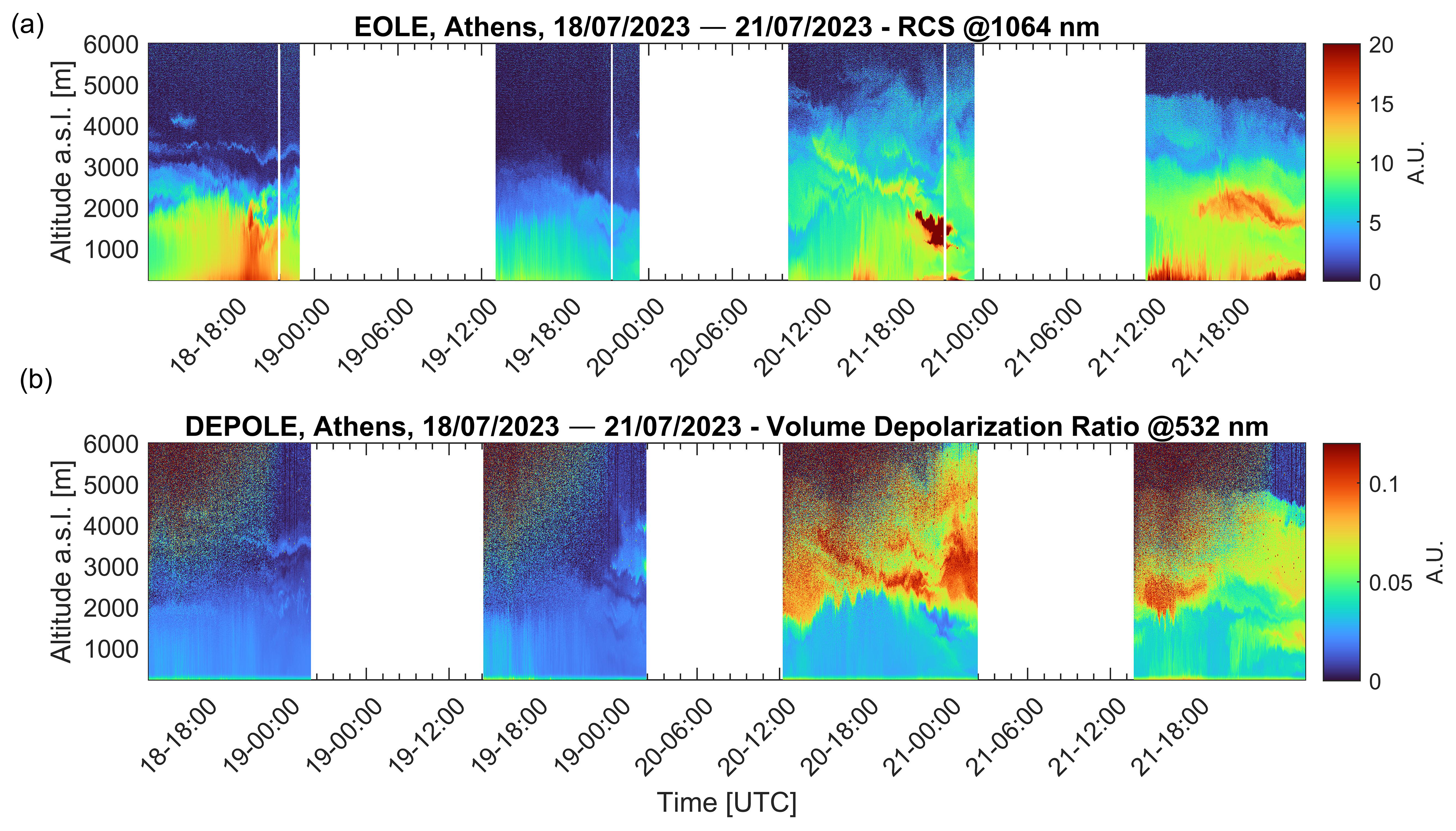 Figure 5Spatio-temporal evolution of the (a) range-corrected lidar signal (RCS) at 1064 nm and (b) volume depolarization ratio at 532 nm for the period 18–21 July 2023.