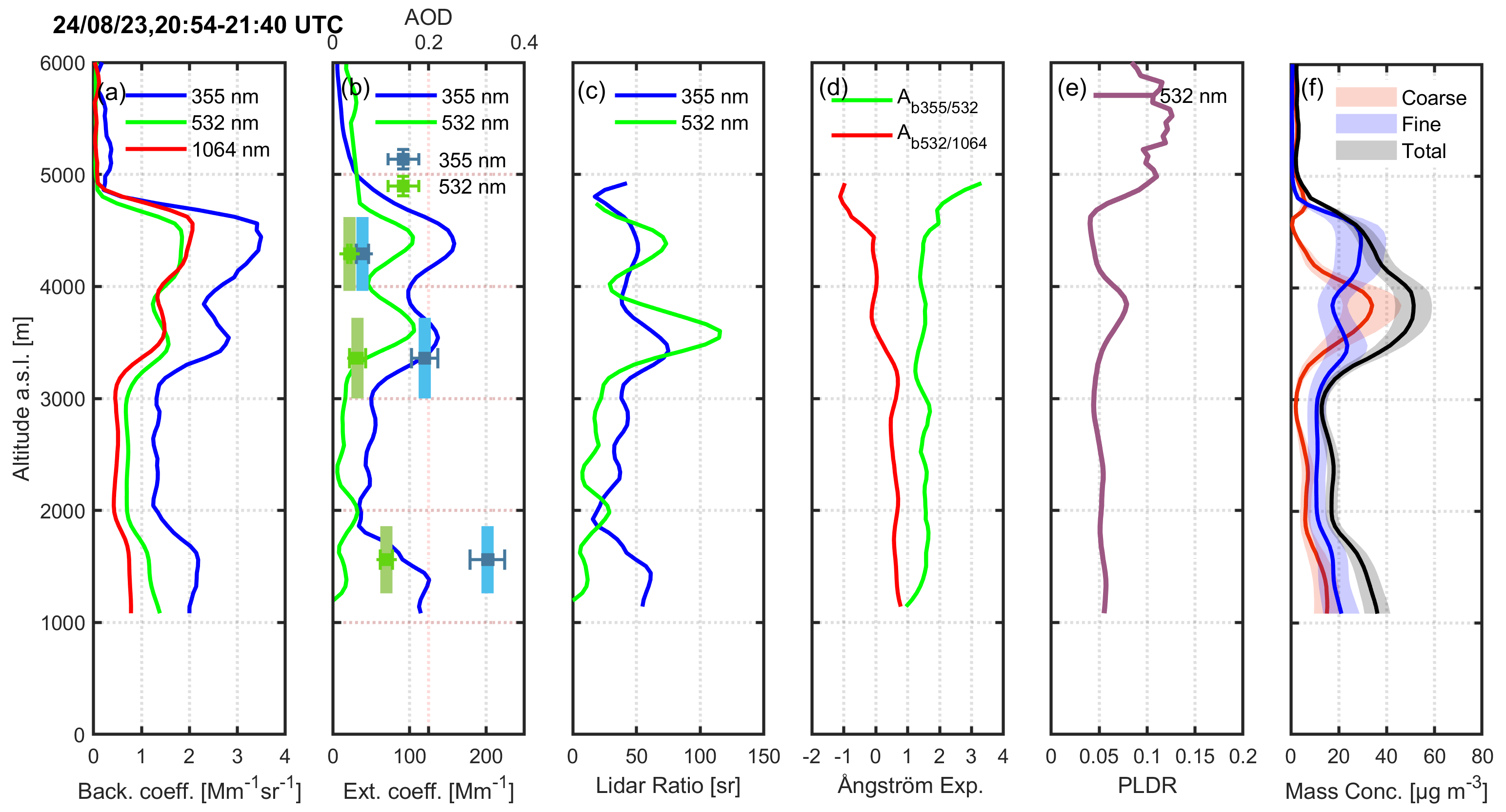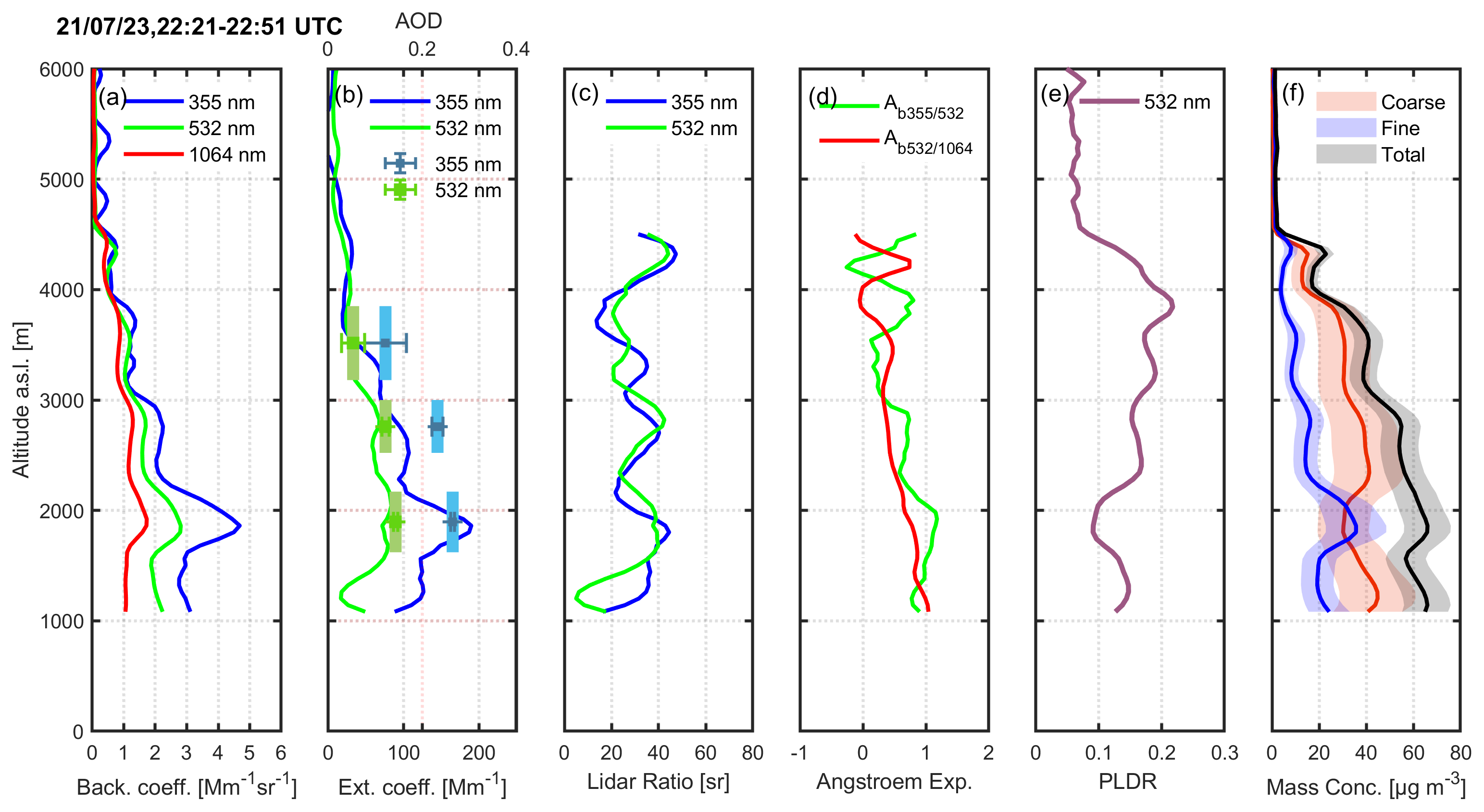 Figure 6Vertical profiles of aerosol (a) backscatter coefficient (355, 532 and 1064 nm) (b) extinction coefficient and AOD (355 and 532 nm) (c) lidar ratio (355 and 532 nm) Ångström (d) m exponent (e) PLDR (532 nm) and (f) aerosol mass concentration (coarse, fine mode and total particles) obtained by the EOLE and DEPOLE lidar systems on 21 July 2023 (18:20–18:50 UTC).