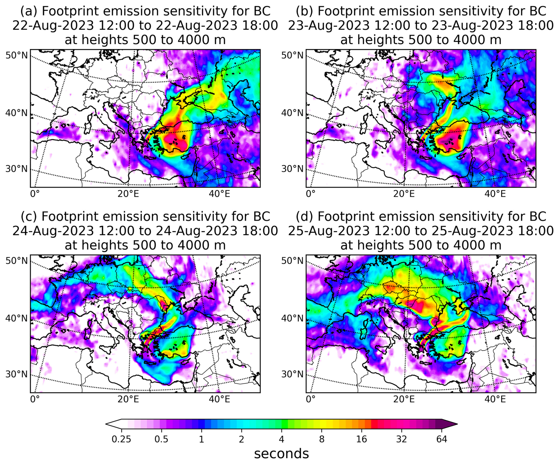 Figure 8Footprint emission sensitivities for BC obtained using FLEXPART for the air masses arriving over Athens between 0.5 and 4.0 km from 22 to 25 August 2023 (12:00 to 18:00 UTC).