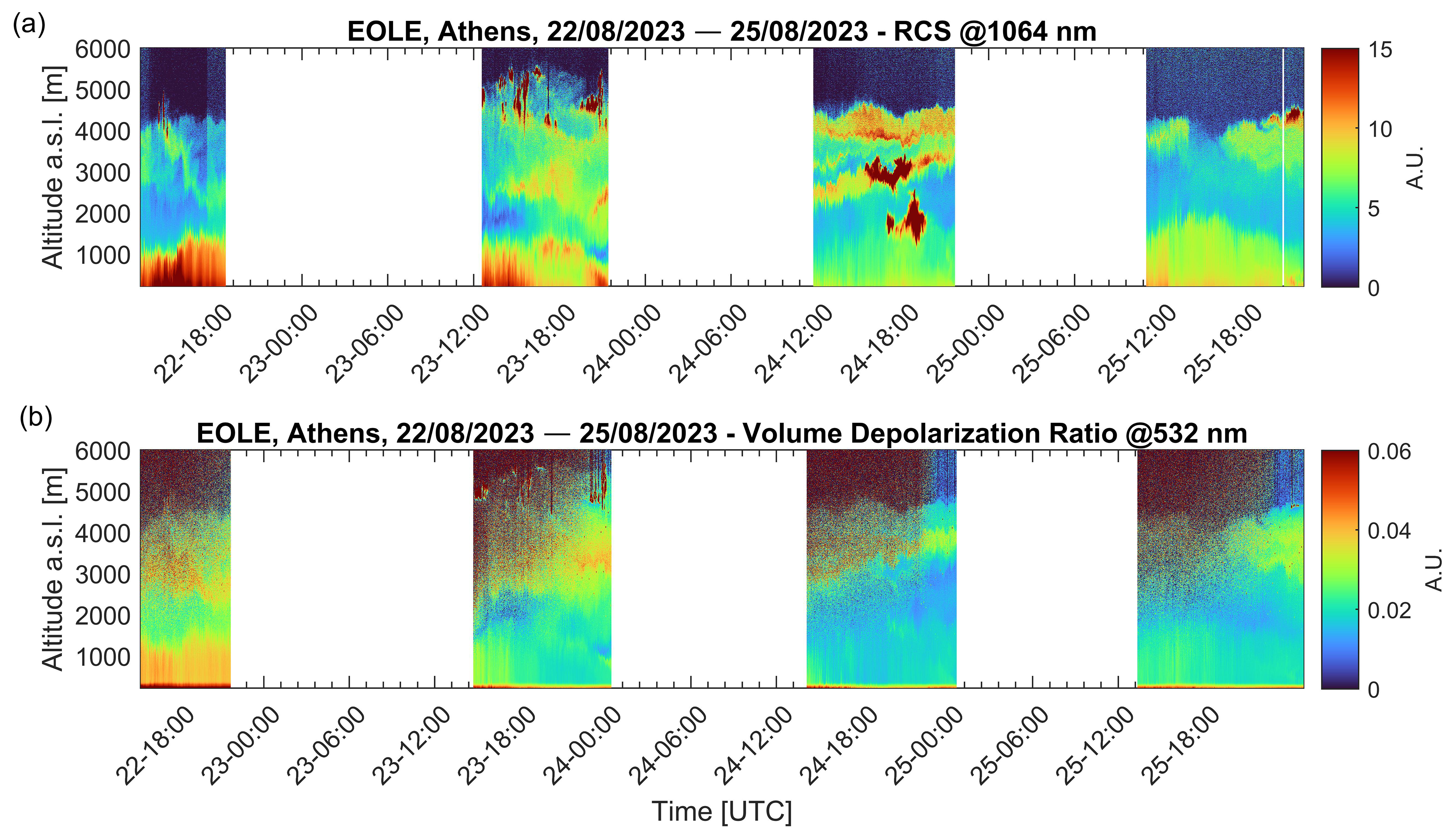 Figure 9Spatio-temporal evolution of the (a) range-corrected lidar signal (RCS) at 1064 nm and (b) volume depolarization ratio at 532 nm for the period 22–25 August 2023.