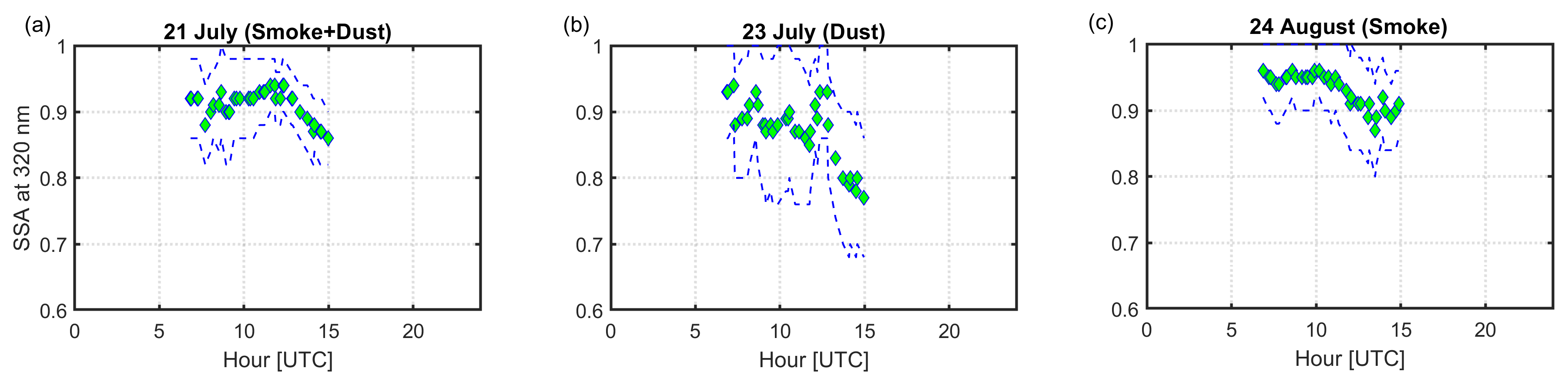 The 315–325 nm wavelength range has been chosen because at these wavelengths, for relatively high aerosol loads (e.g., during wildfire or dust events), the effect of aerosols is dominant over the effect of ozone. For shorter wavelengths (< 315 nm) variations and uncertainties in total ozone induce higher uncertainties regarding the quantification of the impact of aerosols. We consider that the impact of aerosols at these wavelengths is representative for their impact on UV-B (290–315 nm integral). Hereinafter, the 320 nm irradiance is referred to as UV-B irradiance.