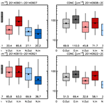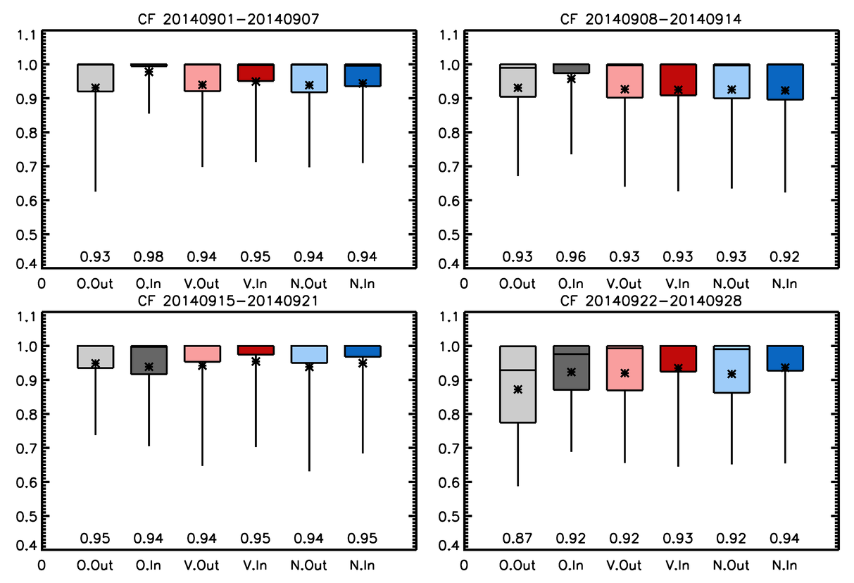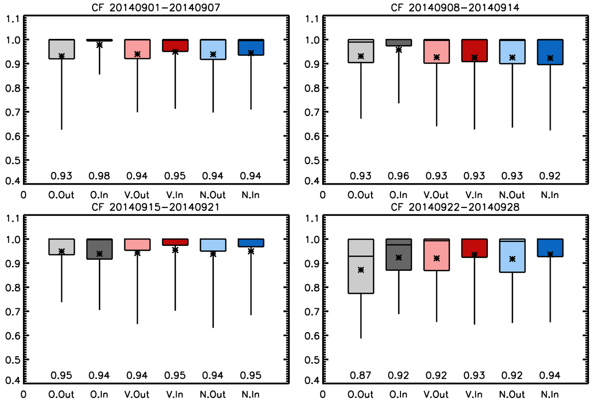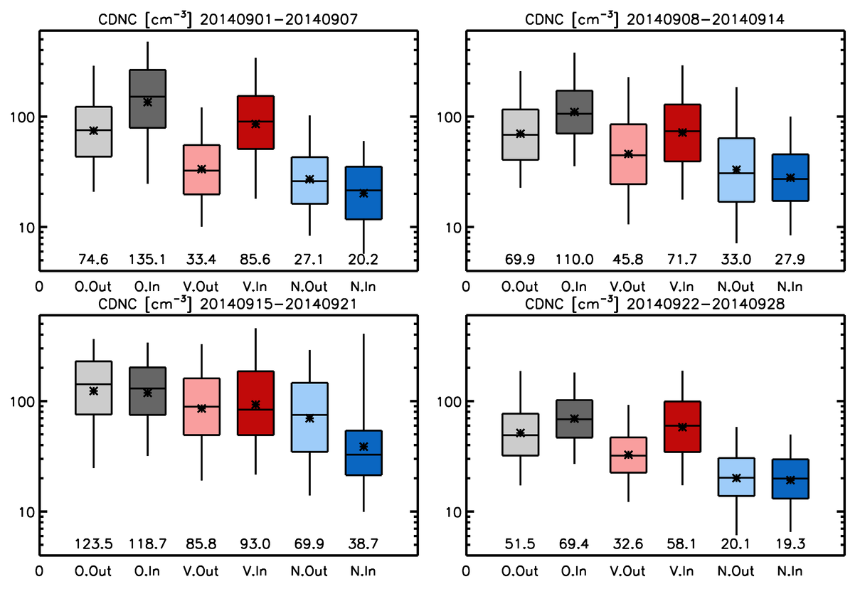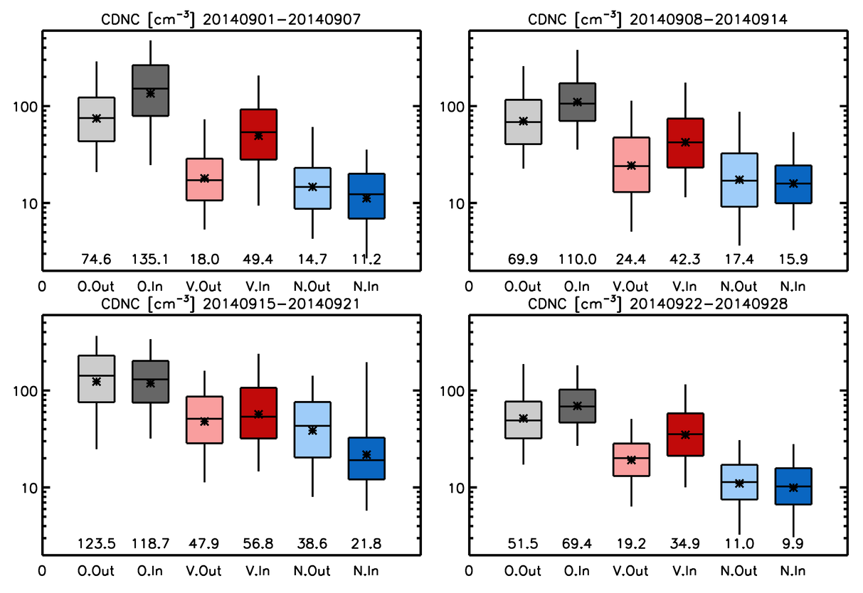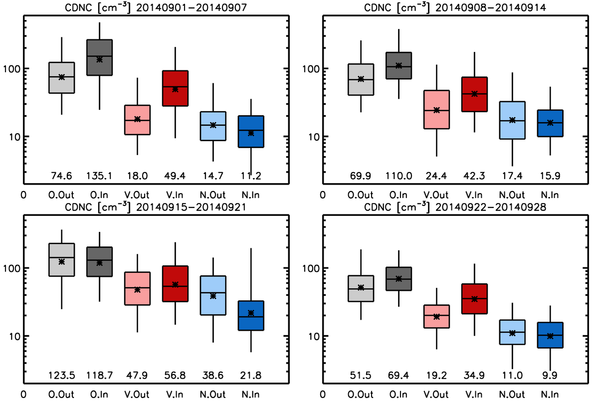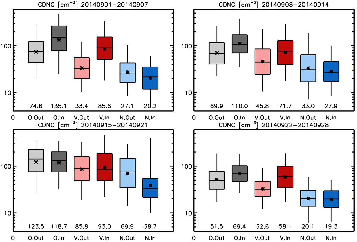Figure 3Box and whisker plots showing the values of CDNC at three quartiles (25th, 50th and 75th percentiles) and the 5th and 95th percentiles for the four weeks from the start of the eruption. Results are shown for the observations (“O” in x-axis and grey), the Volc simulation (“V” and red) and the NoVolc simulation (“N” and blue) within (“In” in x-axis and dark colours) and out of (“Out” and light colours) the volcanic plume judged by column SO2 loading. The geometric means are shown as stars and values near the bottom of the frames. Note that the vertical axis has a log scale. Corresponding probability distribution functions are shown in Fig. S2.