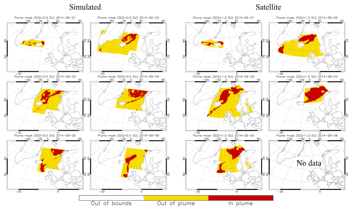 In the following sections we will apply satellite derived plume masks to satellite data and simulation derived masks on simulation data to compare the cloud properties in in-plume and out-of-plume regions. Figure 1 shows the plume masks from the satellite and the model from 1 to 6 September 2014 (day 2–7 of the Holuhraun eruption). The masks for the rest of the simulation period (7 to 28 September) are shown in Fig. S1 in the Supplement. The masks created from the simulation agree well with those from the satellite data.