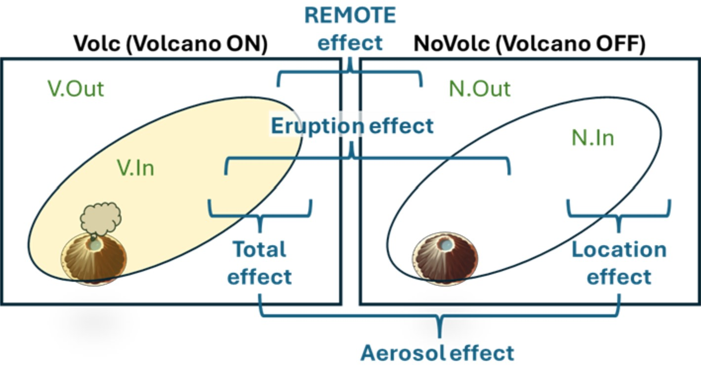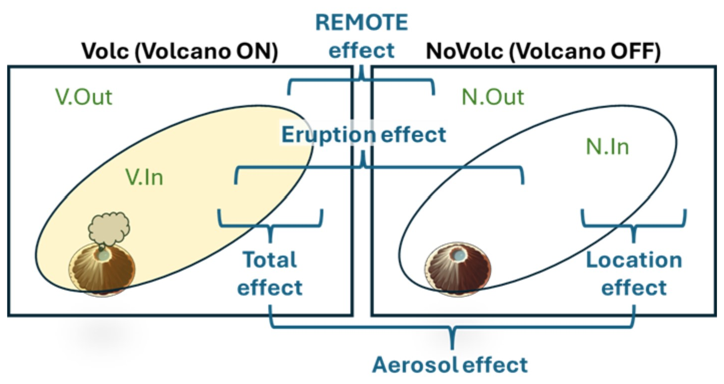 In simulations we can use the counterfactual NoVolc scenario to estimate the effects of different background meteorology and other environmental factors depending on the location of the plume. We call this the “LOCATION effect” and calculate it as the difference between arithmetic means, or the quotient between geometric means, inside and outside the plumes in the NoVolc simulation.