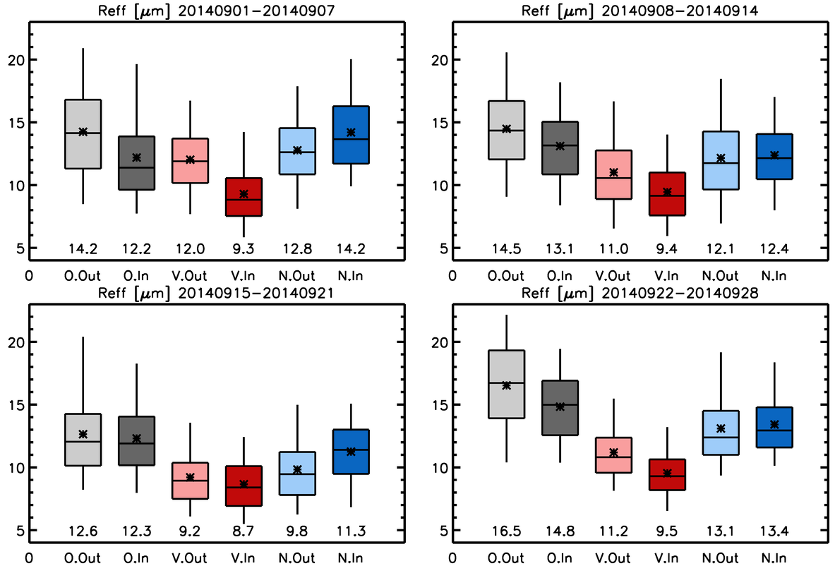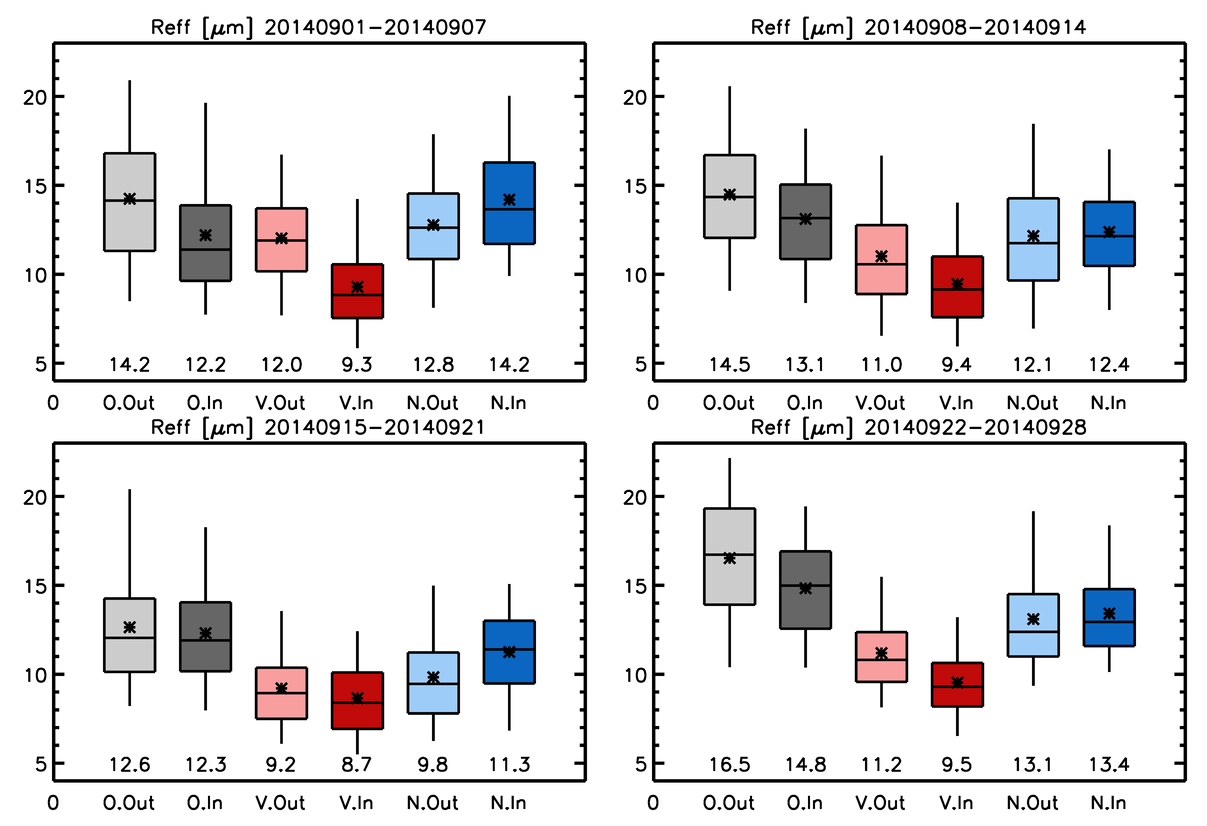 Figure 6Same as Fig. 4, but for droplet effective radius. Note that the vertical axis has a linear scale and the values at the bottom and shown in stars are arithmetic means. Corresponding probability distribution functions are shown in Fig. S5.