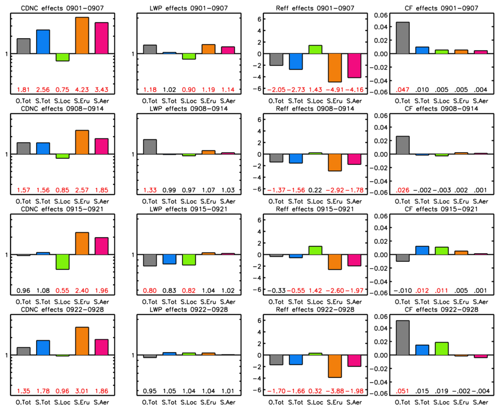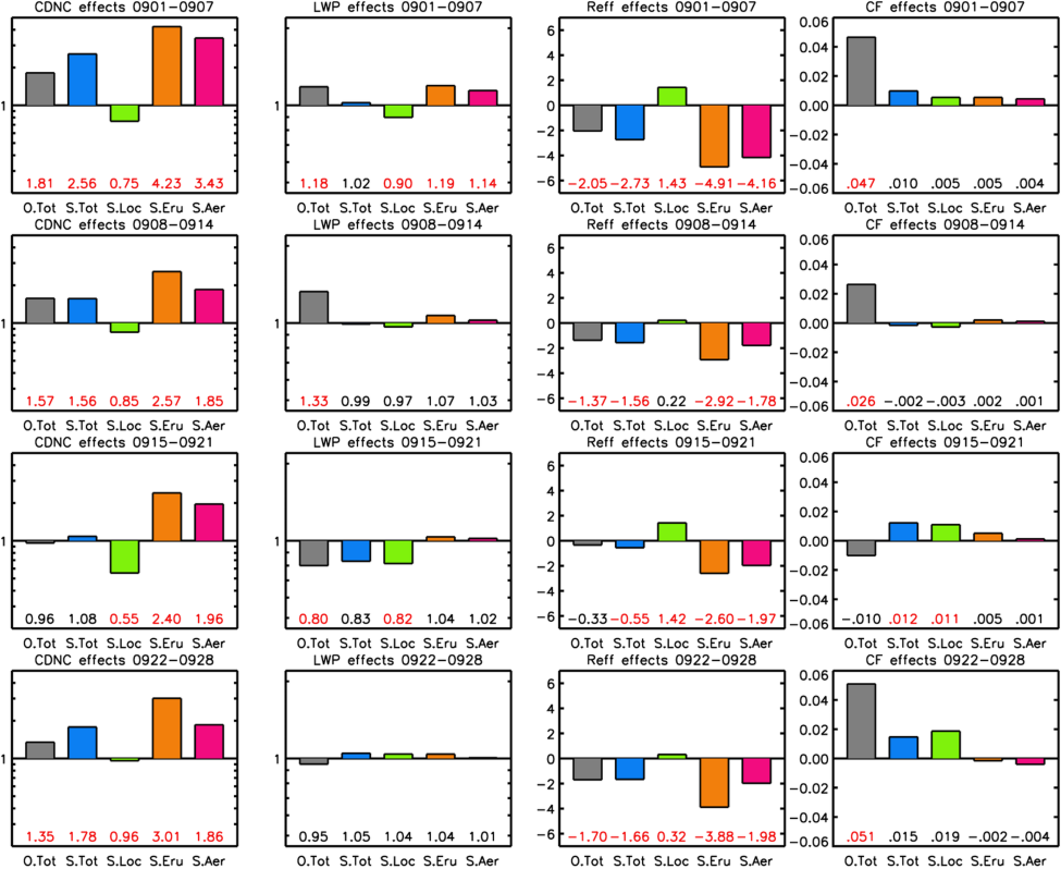 Figure 8Mean TOTAL effect of the volcanic plume for the observations (O.Tot) and the simulations (S.Tot), and mean LOCATION, ERUPTION, and AEROSOL effects for the simulations (S.Loc, S.Eru, and S.Aer). See text for descriptions. Results are shown for CDNC, LWP, Reff, and CF (columns) and for the first four weeks after the eruption (rows). Note that base 10 log y-axis scales and enhancement ratios (e.g., TOTAL effect for the simulation = V.In/V.out, see Table 2) are used for the CDNC and LWP effects, whereas linear scales and subtracted values (e.g., V.In minus V.out) are used for Reff and CF. Means are geometric for CDNC and LWP and arithmetic for Reff and CF. Values at the bottom of the panels show the mean effect values (same as the bars) and are red if the mean effect is significant at 0.05 level in t-test (see Table 3).
