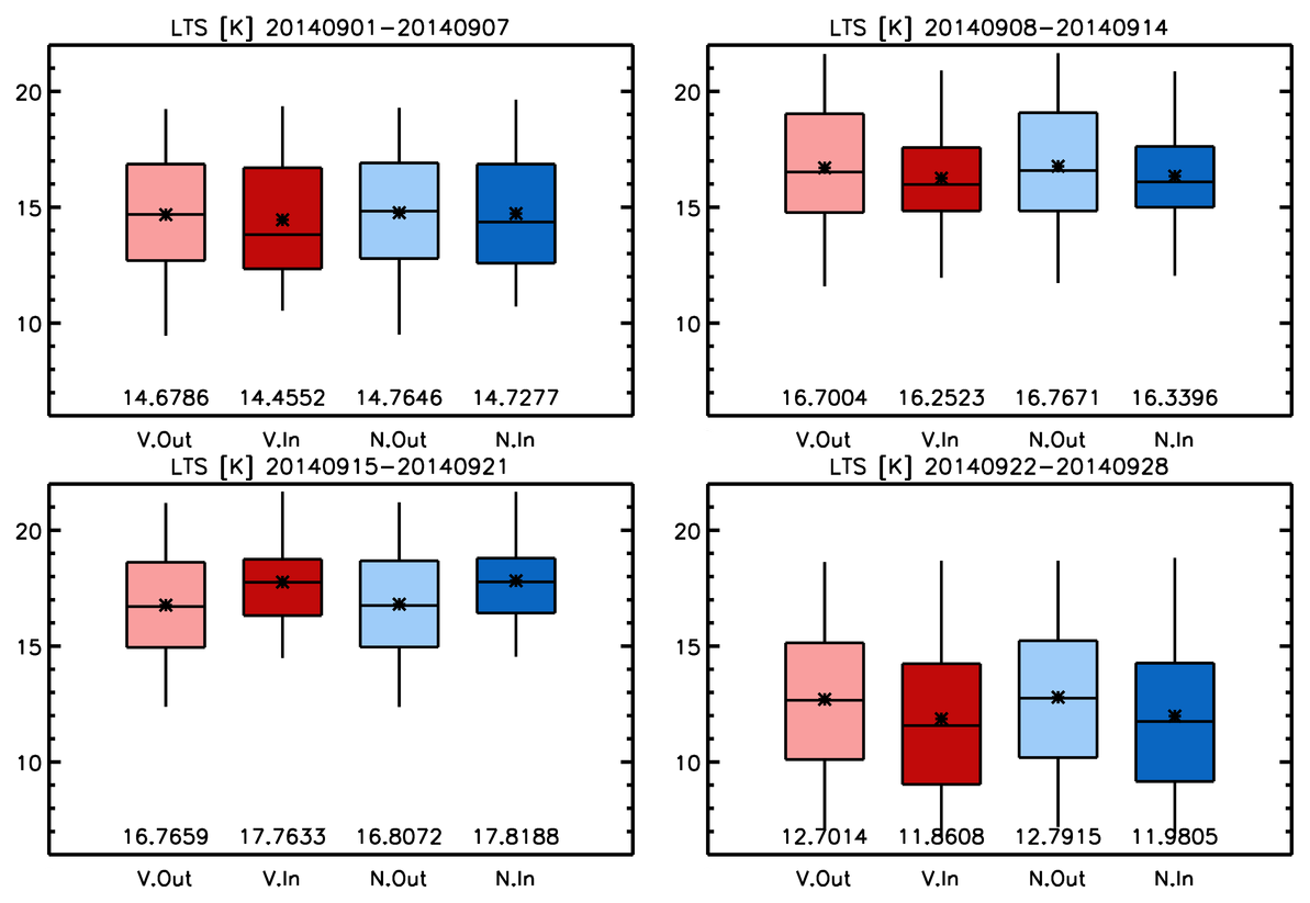 Figure 9Box and whisker plots for the lower tropospheric stability (LTS: the difference between the potential temperatures at the 700 hPa level and the surface) within and outside the plume regions for the Volc and NoVolc simulations over the four weeks. Color scheme and all other figure formats are the same as all other box and whisker plots.