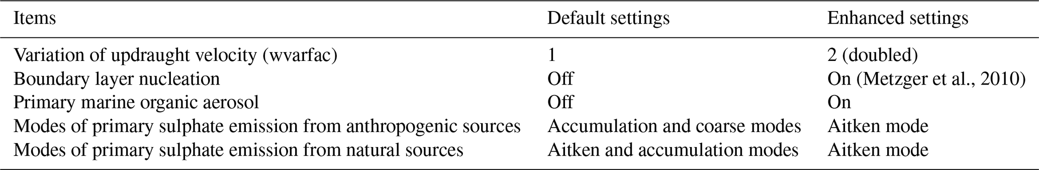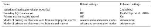 Since the original simulation underestimated the observed cloud droplet number concentrations as will be shown in Sect. 3, we modified some of the model settings and parameter values to enhance the background aerosols and clouds. Table 1 shows the changes between the default model and the enhanced aerosols and clouds configuration of the model. The model assumes that 2.5 % of SO2 is emitted as primary sulphate particles, and this modification changes the modes of these emissions to the smaller Aitken mode from larger size modes in line with Yoshioka et al. (2019). However, this does not affect the Holuhraun volcanic emission for which no primary sulphate emission is assumed.