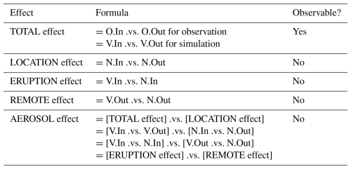 Table 2Formulations for TOTAL, LOCATION, ERUPTION, REMOTE, and AEROSOL effects. “O”, “V”, and “N” represent the observations and Volc and NoVolc simulations, respectively. “In” and “Out” indicate inside and outside of plume, respectively. “.vs.” means either “−” (minus) for Reff and CF where linear statistics are used or “/” (divided by) for CDNC and LWP where geometric statistics are used.