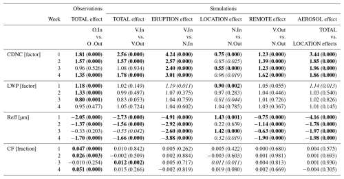 Table 3TOTAL, ERUPTION, LOCATION, REMOTE, and AEROSOL effects and corresponding p-values from t-tests (in parentheses) for CDNCs, LWPs, Reffs, and CFs. Values shown in bold indicate statistically significant differences between the means of two distributions at the 0.01 level (p<0.01). Values with p-values between 0.01 and 0.05 are shown in italics, indicating marginal significance. All other values are not statistically significant at the 0.05 level (p>0.05). Note that for CDNC and LWP, effects and t-tests are based on geometric means and the base 10 logarithms, respectively. For Reff and CF, they are based on arithmetic means and their values themselves. Model and satellite fields contain significant correlation between neighbouring grid points. Therefore, to obtain a more realistic estimate of the degrees of freedom used to compute the t-statistic the model field have been horizontally lagged until autocorrelation was reduced to 0.3 (e.g. Field and Wood, 2007). This lagging (∼ 150–200 km) was used to combine independent samples to calculate the t-statistic.