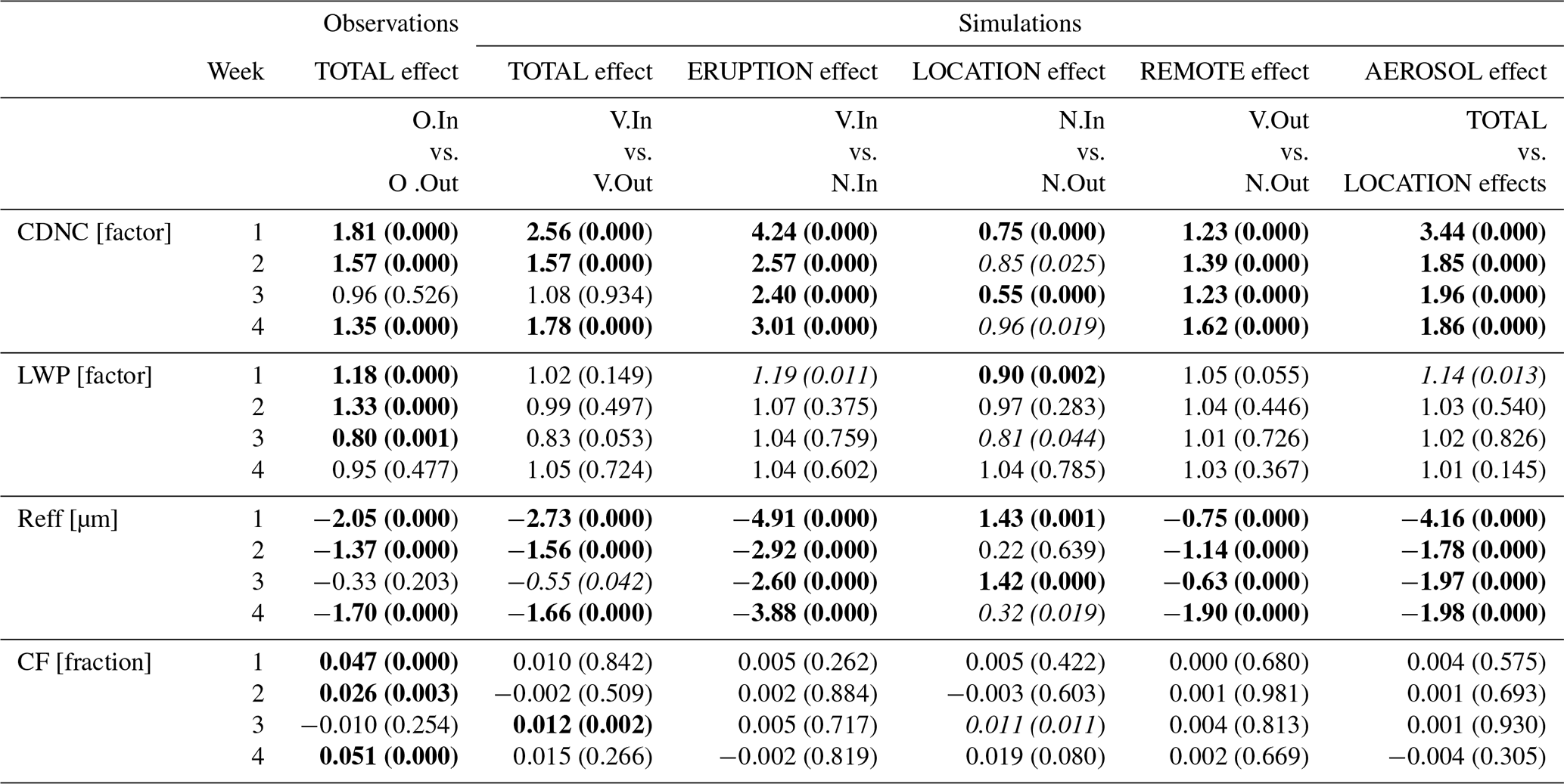 Background Reff (Fig. 6) are underestimated by up to about 30 % (O.Out vs. V.Out). But the differences between in-plume and out-of-plume values (TOTAL effect) for models and observations are similar, including the weak response for the 3rd week. This mirrors the CDNC response since, for a constant LWP, Reff will scale inversely with CDNC and in-plume and out-of-plume LWP values are very similar in the model. For the observations there are LWP increases in weeks 1 and 2, but there is still a reduction in Reff for these weeks indicating that the increase in CDNC dominates over the LWP increase in terms of causing the Reff response. Following the change in CDNC, Reff is also significantly reduced for the eruption effect (factors of 0.65–0.77). As was the case for the CDNC, Reff shows a non-zero remote effect of up to −15 % that is deemed significant. The location effect again follows the CDNC response with significant differences in the 1st and 3rd weeks.