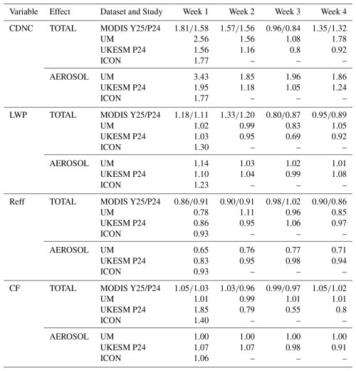 Table 4Simulated in-plume enhancements (TOTAL effects) in the first 4 weeks of September 2014 in this study (UM) compared with the observed enhancements from the 1° MODIS data presented in Peace et al. (2024; P24), those from the 0.5° MODIS data produced for this study (Y25), as well as UKESM1 results (grid resolution 1.9×1.3°). Both the TOTAL effect (ratio of values between inside and outside plume) and the AEROSOL effect values are shown. For P24, the AEROSOL effect was calculated using the values in their table 1 as (in-plume enhancement in “Hol” (%)/100 + 1)(in-plume enhancement in “Ctrl” (%)100 + 1), where “Hol” is their simulation with the Holuhraun volcano on and “Ctrl” is their simulation with no volcano. ICON simulation (grid resolution 2.5 km) results for the first week are also included from Haghighatnasab et al. (2022). Note that the TOTAL and AEROSOL effects for all variables are presented as ratios here, including those for Reff and CF, which were shown as differences in Sect. 3, in order to facilitate comparisons with P24 and ICON.