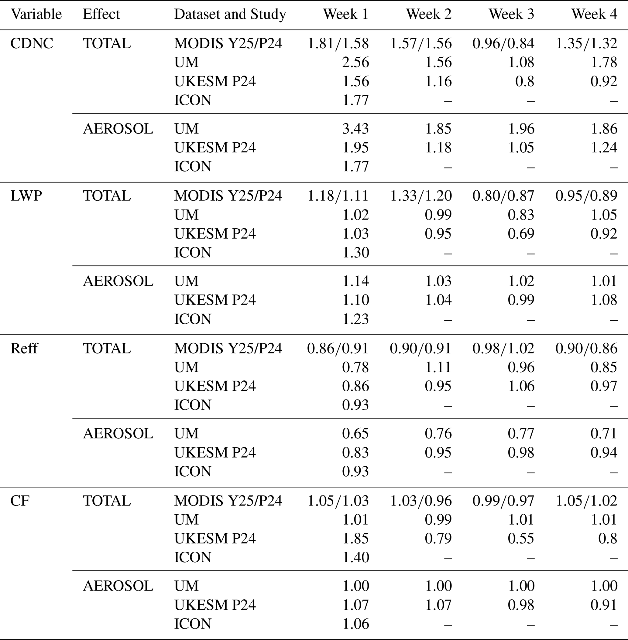 For CF the observational datasets hover around 1.0 with variations between the different modelling results of 0.02 to 0.07 with the Peace et al. (2024) coarser data showing some reductions in cloud cover at the same time as the higher resolution data analysis shows slight increases highlighting the difficulty in assessing aerosol impacts on this variable. The model enhancements are not deemed significant. We note that Koren et al. (2007) demonstrated that CF estimates based on AOD thresholds were difficult due to the presence of humidified aerosol close to clouds. Any apparent change in CF associated with changes in aerosol may reflect this potential misidentification of cloud. Furthermore, Mieslinger et al. (2022) noted that greater aerosol loading could lead to increased cloud reflectivity that increases the probability of previously undetected optically thin clouds becoming optically thick enough to be detected as cloud in CF satellite products. Chen et al. (2022) found with their machine learning model that increasing aerosol could lead to increased CF, but it is unclear if the effects highlighted by Koren et al. (2007) and Mieslinger et al. (2022) could be contributing to this result, and further study with multiple satellites to test cloud-resolving physical models and explore the underlying processes is warranted. The UKESM total effect shows large changes from enhancements of 1.85 in week 1 to reductions of 0.55 in week 3. In stark contrast the UM does not show much change, although it should be noted that cloud cover is close to maximum for the UM. However, the aerosol effect changes are more similar.