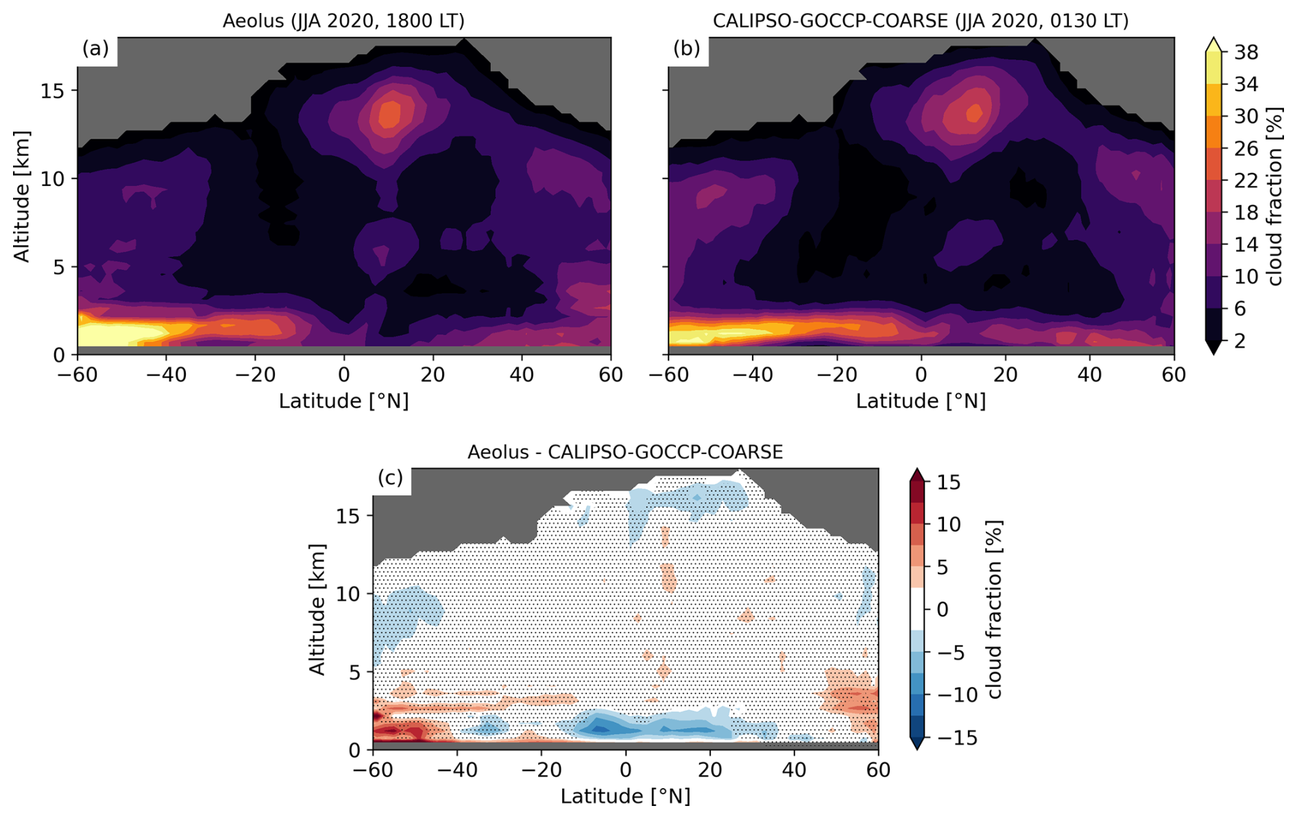 Figure 2Zonal average cloud fraction profiles for (a) Aeolus at 18:00 LT and (b) CALIPSO-GOCCP-COARSE at 01:30 LT corrected for the diurnal cycle (c) is the absolute difference of cloud fraction between Aeolus and CALIPSO-GOCCP-COARSE. Non-significant differences (two sided T-test with p-values>0.05) are dotted. The lowest bin encompasses the surface and is discarded in this study (opaque gray bar). Cloud fractions<1 % are masked in gray.