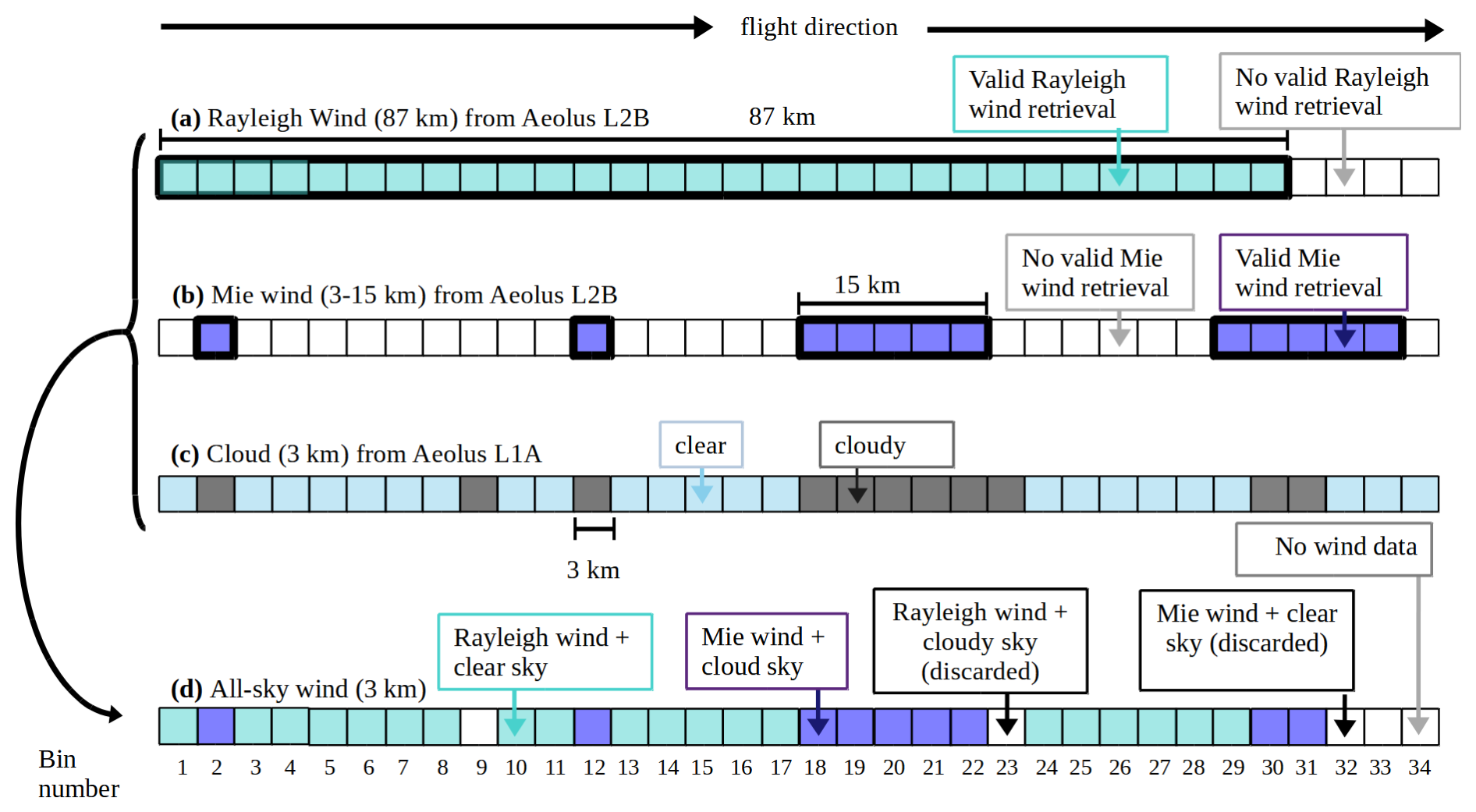 Making use of the cloud mask (Fig. 3c), we select for each bin, either a Rayleigh (Fig. 3a) or a Mie (Fig. 3b) wind to build the all-sky wind. Consider bin 2, (Fig. 3) where both Rayleigh and Mie winds coexist. As a cloud was detected (bin 2, Fig. 3c), we select the Mie wind as an element of the all-sky wind (bin 2, Fig. 3d). For bin 29, both Rayleigh and Mie winds also coexist, however, the sky is flagged as clear, so we select the Rayleigh wind as the all-sky wind (bin 29, Fig. 3d). For bin 23 where a cloud is detected, with a Rayleigh wind but no Mie wind, we decide to report “no data” in the all-sky wind dataset instead of a Rayleigh wind (bin 23, Fig. 3d). In a similar way, for bin 32 which shows no Rayleigh wind but a Mie wind in clear sky conditions, we report “no data” instead of a Mie wind (bin 32, Fig. 3d). If a bin is flagged as fully attenuated but a wind was retrieved, it is discarded. By doing so, we ensure that the Rayleigh winds indeed correspond to clear sky situations and the Mie winds to cloudy sky situations, consistently with our cloud mask.