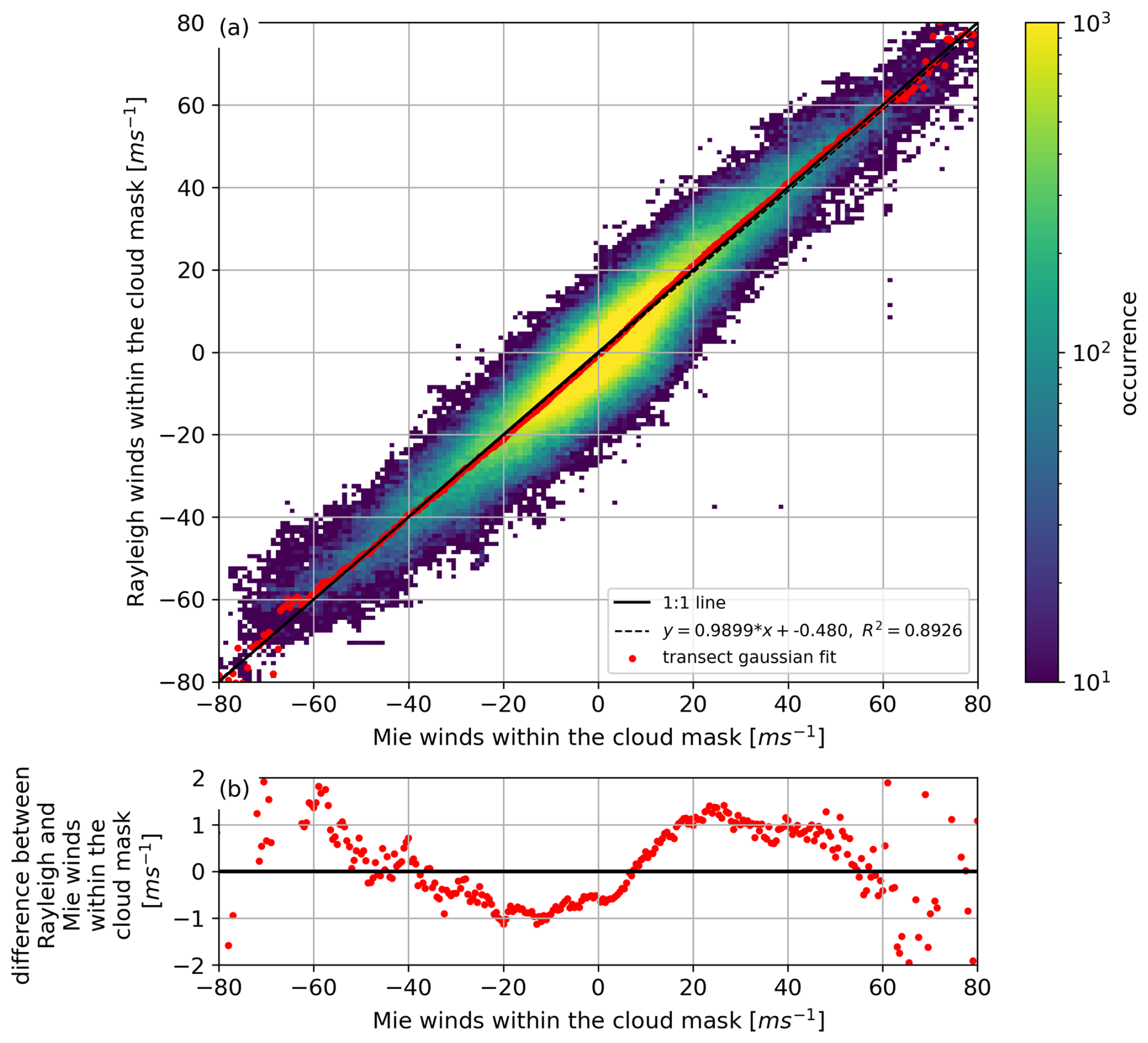 Figure 4(a) 2D-PDF of pairs of colocated Mie winds and the Rayleigh winds when they both coexist within the cloud mask. The black dotted line represents the best linear regression. The 1:1 line is represented as a solid black line. For each point along this 1:1 line, a Gaussian was fitted to all data points lying along a perpendicular transect. Where the data spread and statistics allow a satisfactory fit, the maximum of the Gaussian is plotted as a red filled circle each 0.5 m s−1. (b) Maximum of the Gaussian of the differences between Rayleigh and Mie winds within the cloud mask as a function of the Mie winds within the cloud mask. A sample of 50 orbit files of the year 2020 are analysed with a total of 106 bins of 3 km×480 m where both Rayleigh and Mie winds coexist within the cloud mask.