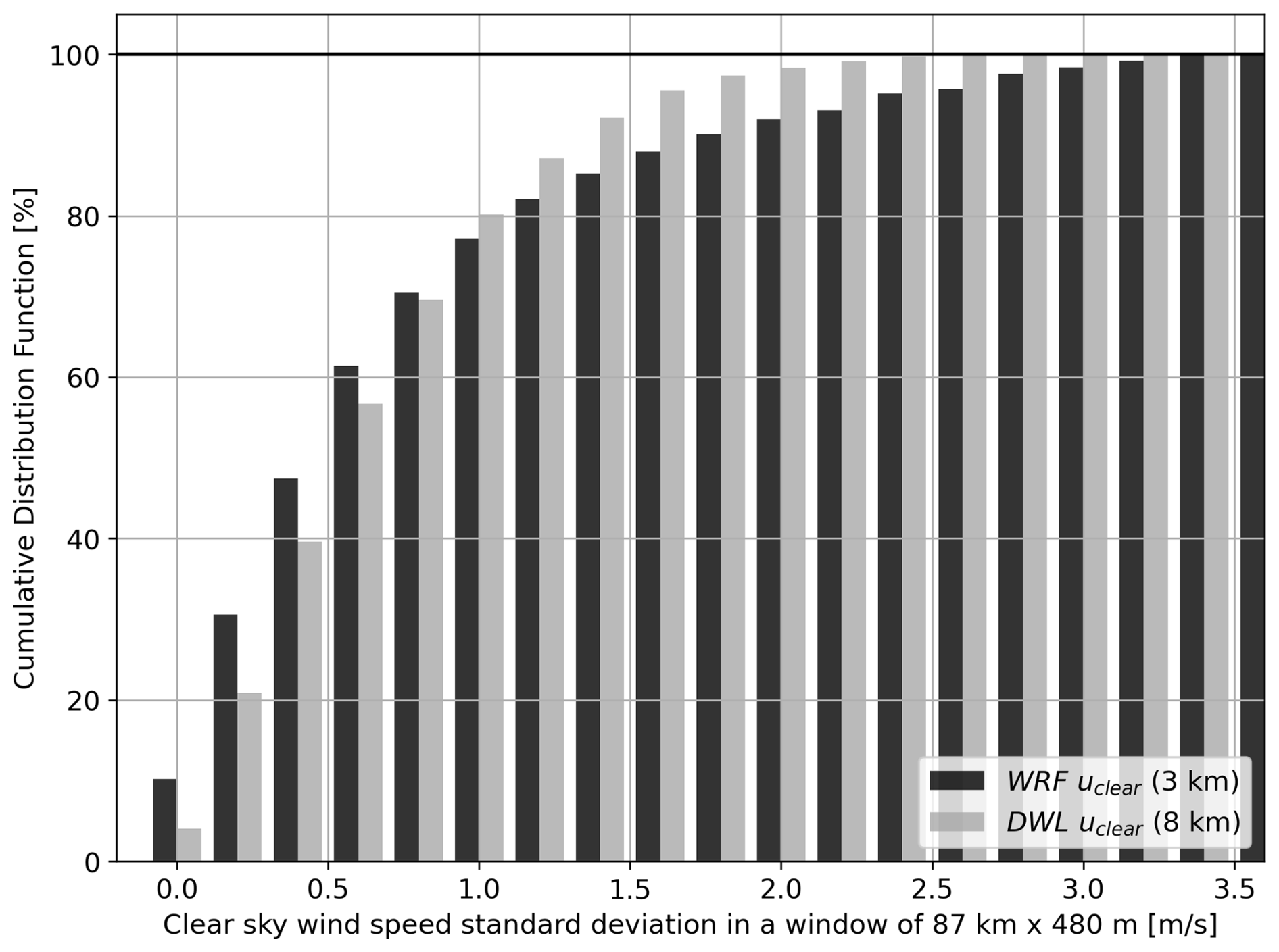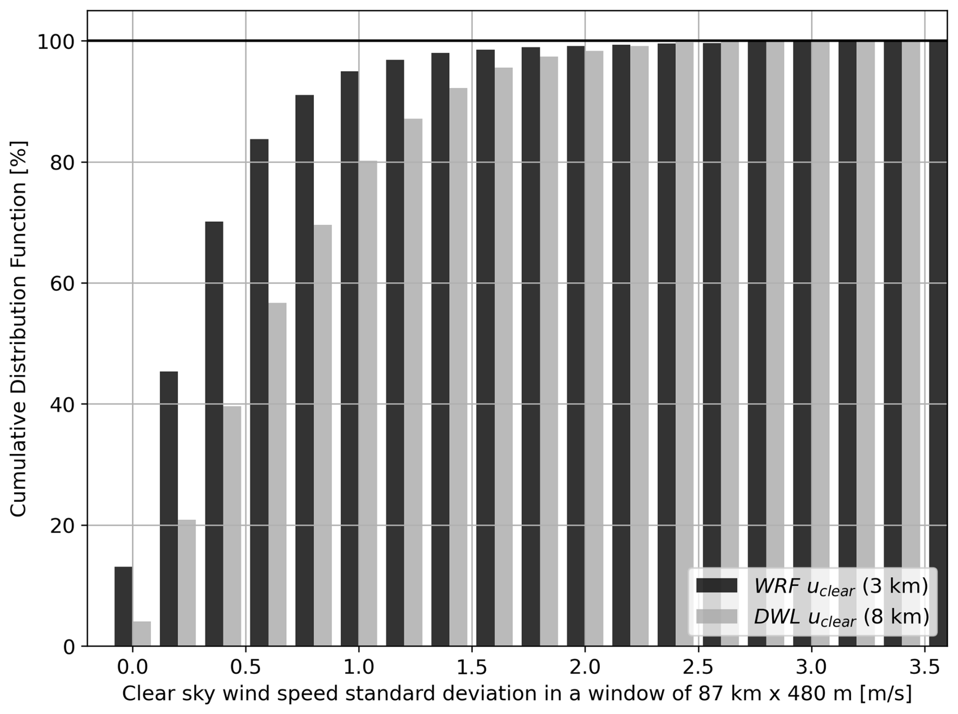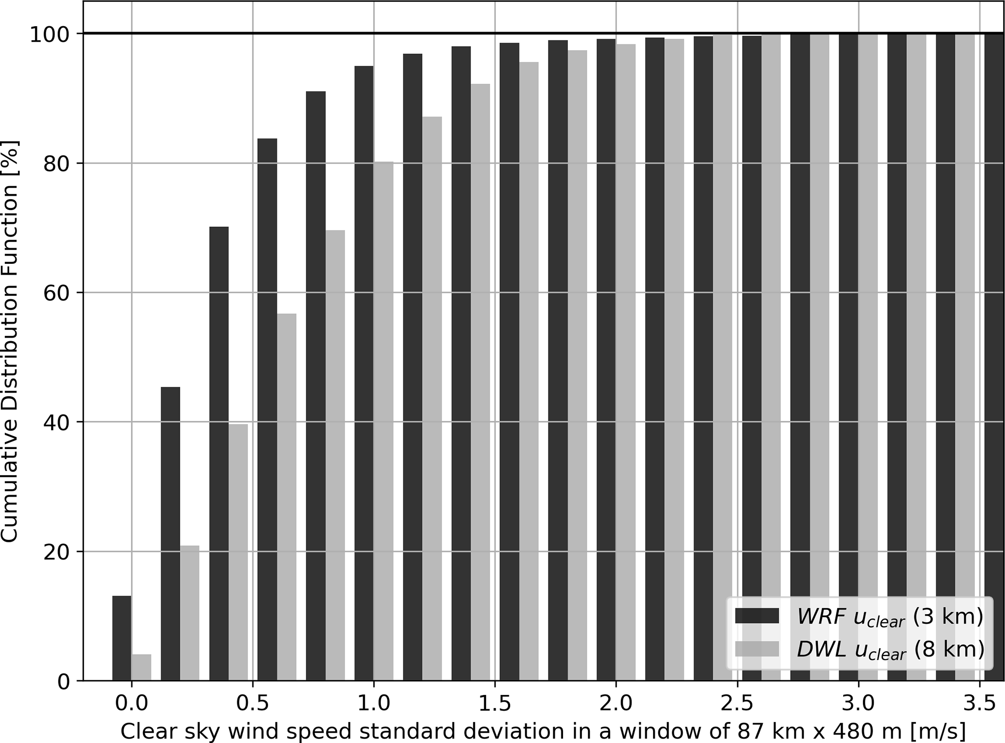 Figure 5Standard deviation of the wind speed within a segment of 87 km as observed by the airborne DWL with a horizontal resolution of 8 km and from a WRF model scene with a horizontal resolution of 3 km. DWL and WRF wind profiles are averaged vertically to a resolution of 480 m, similar to our Aeolus dataset. All altitudes between the surface and 10 km are included.
