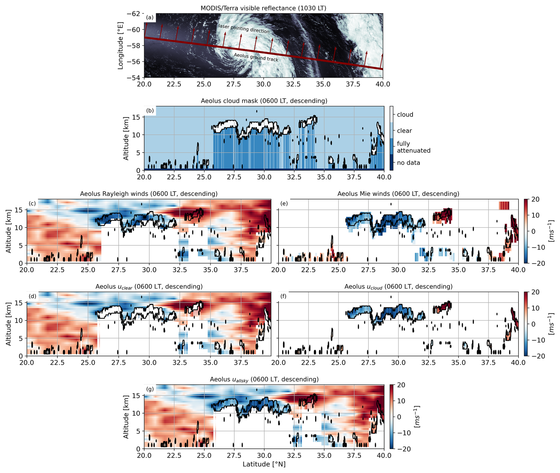 Figure 6(a) Descending orbit segment crossing the tropical cyclone Paulette over the Atlantic ocean (2020-09-12T09–2020-09-12T11) plotted in red over a MODIS/Terra reflectance image. The red arrows represent the laser pointing direction. (b) Aeolus cloud mask. Aeolus (c) all Rayleigh winds and (d) Rayleigh winds only outside of the cloud mask, noted uclear along the paper. Aeolus (e) all Mie winds, (f) Mie winds only within the cloud mask, noted ucloud along the paper. (g) All-sky winds, noted uallsky, result from the merging of uclear and ucloud. The winds are negative when blowing westward and positive when blowing eastward. For panels (b–g), the resolution of the re-sampled data is 3 km horizontally and 480 m vertically and the black contour is the cloud mask.