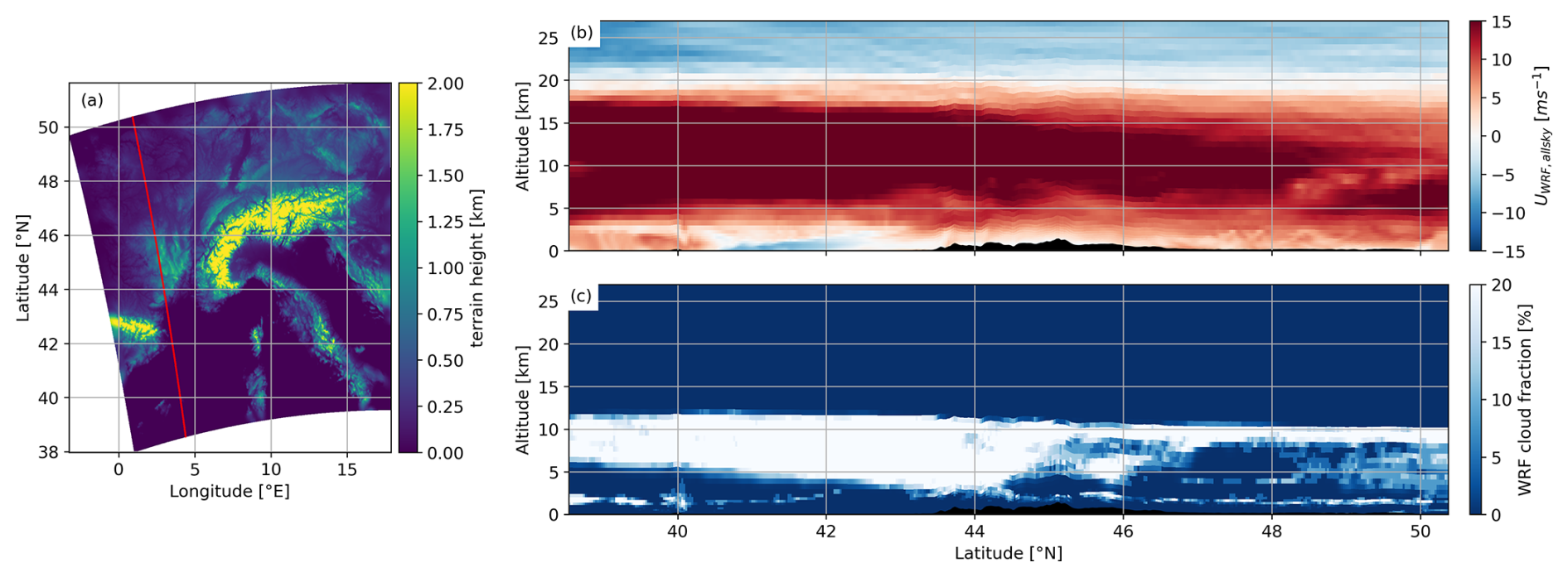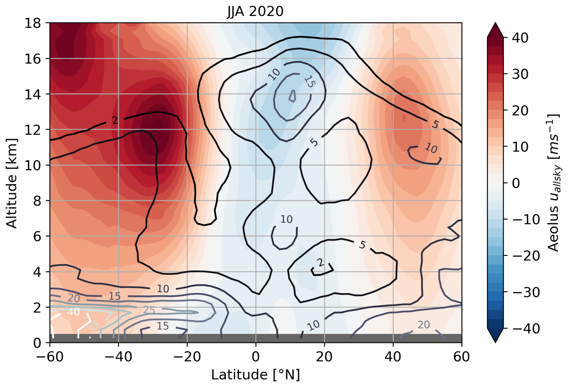 Figure 7(a) Zonal average of all-sky wind speed profiles from June–August 2020. Contours represent the zonal average cloud fraction.