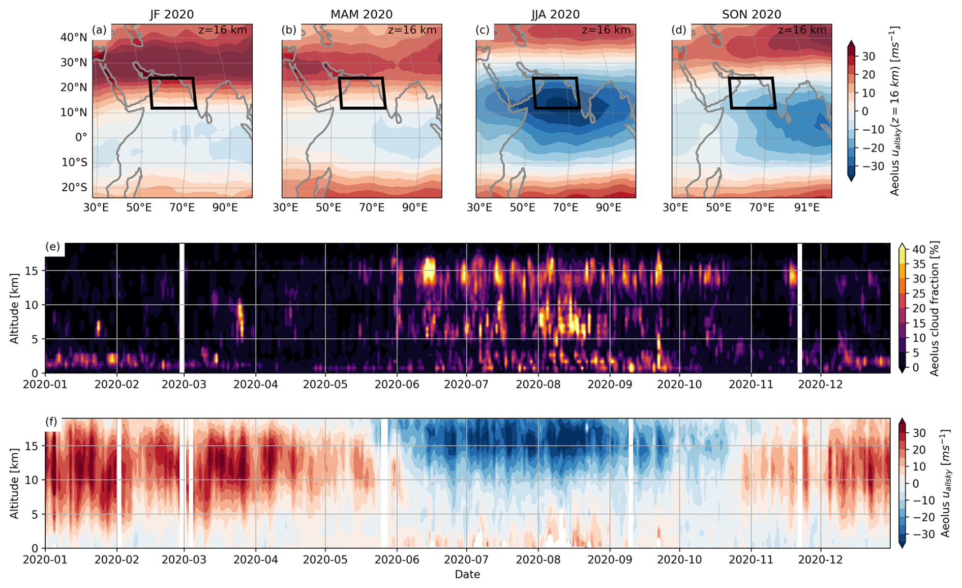 Figure 9(a) map of the averaged all-sky wind speed uallsky (z=16 km) during the months of January and February 2020; (b–d) are the same for respectively March–May, June–August and September–November 2020. The rectangle (12–24° N, 55–75° E) represents a domain selected as it is under the influence of the Tropical Easterly Jet during summer. Time series at a daily resolution of (e) the average profiles of cloud fraction within the domain and (f) the average profiles of all-sky wind speed within the domain.