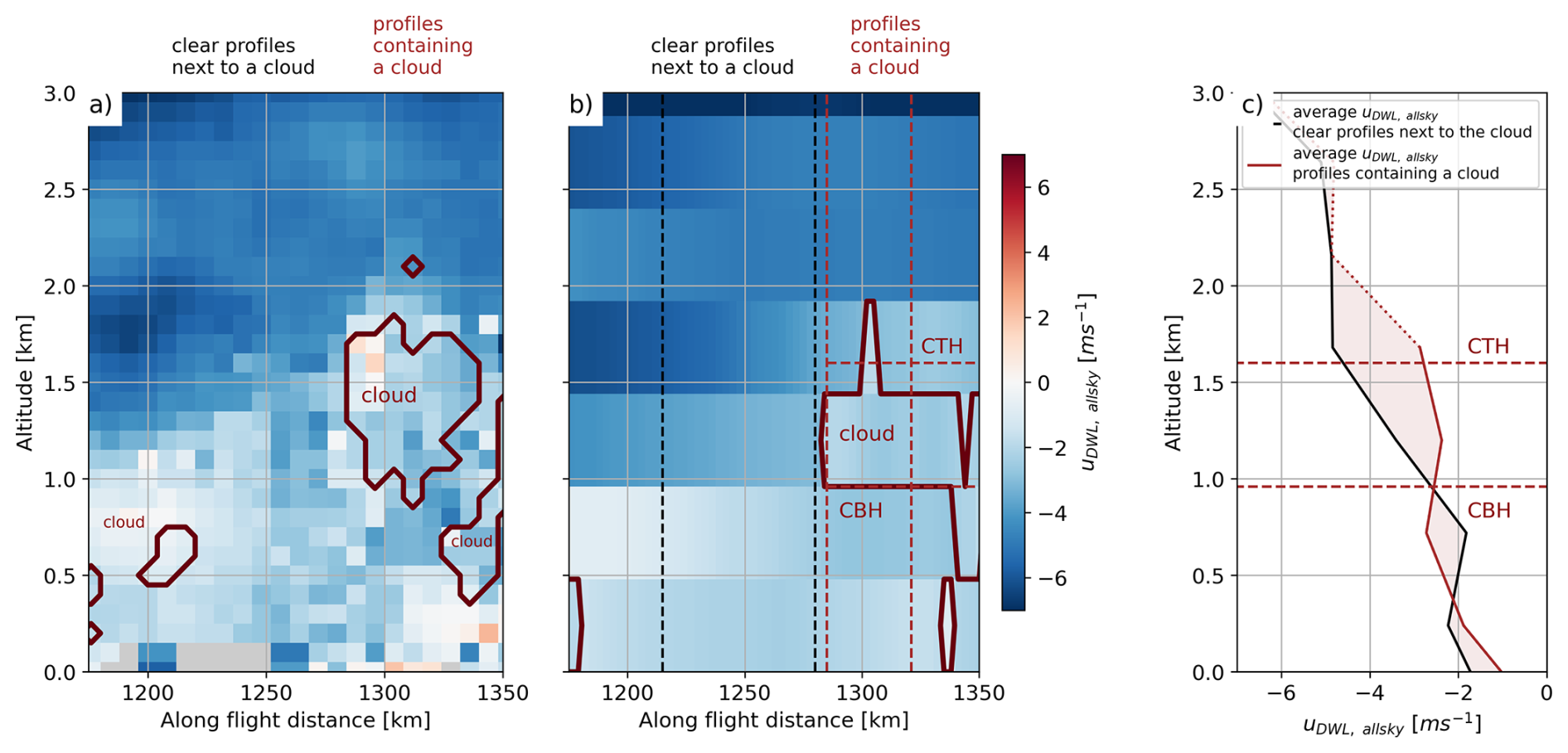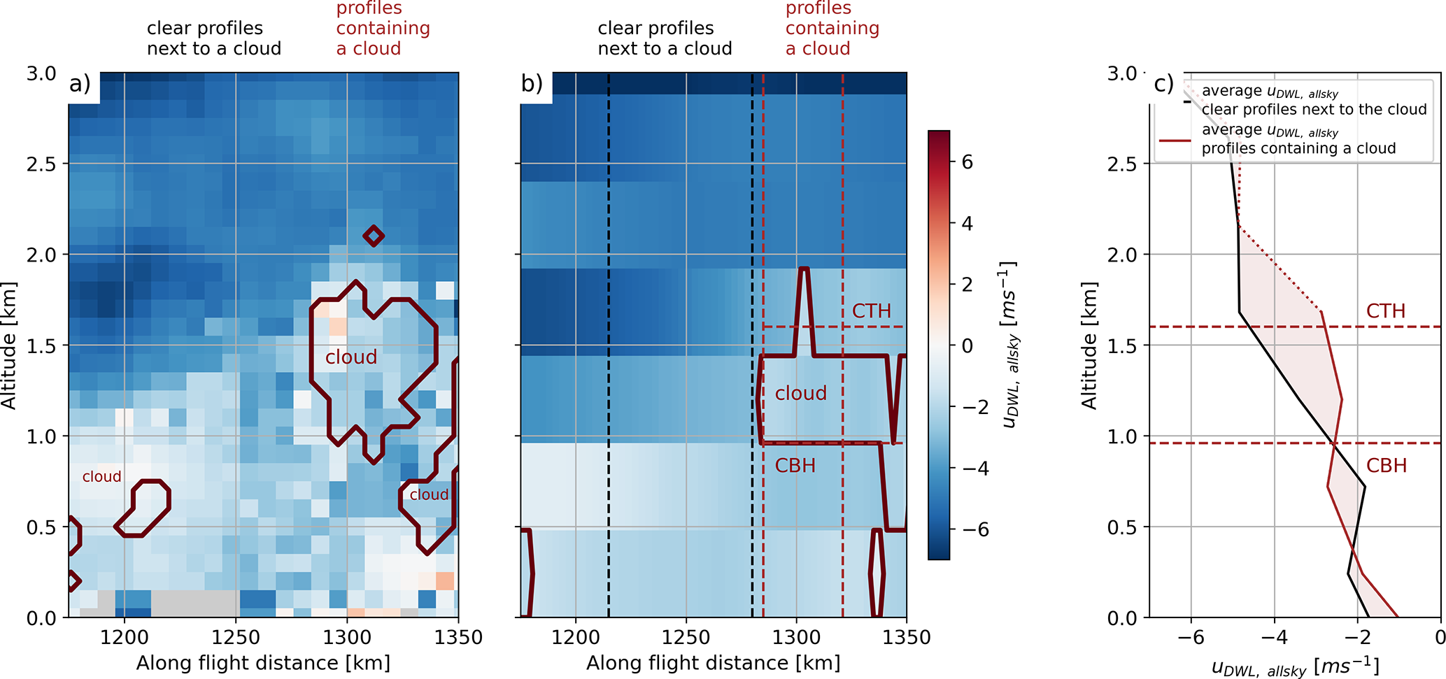 Figure 10(a) Curtain of uDWL, allsky acquired by the airborne DWL and projected along the laser pointing direction of Aeolus during the AVATAR-T campaign. (b) is the same uDWL, allsky wind curtain coarsened at the resolution of our Aeolus dataset (3 km along flight direction, 480 m vertically). The cloud mask is also coarsened and clouds are represented with solid red contours. Vertical red dashed lines represent the horizontal extent of the profiles encompassing a cloud while vertical black dashed lines represent the horizontal extent of clear sky profiles next to the clouds. Horizontal red dashed lines mark the average Cloud Base Height (CBH) and Cloud Top Height (CTH) for the profiles encompassing a cloud. (c) Profiles of uDWL, allsky encompassing the cloud (red curve) and in the clear sky surrounding the cloud (black curve).